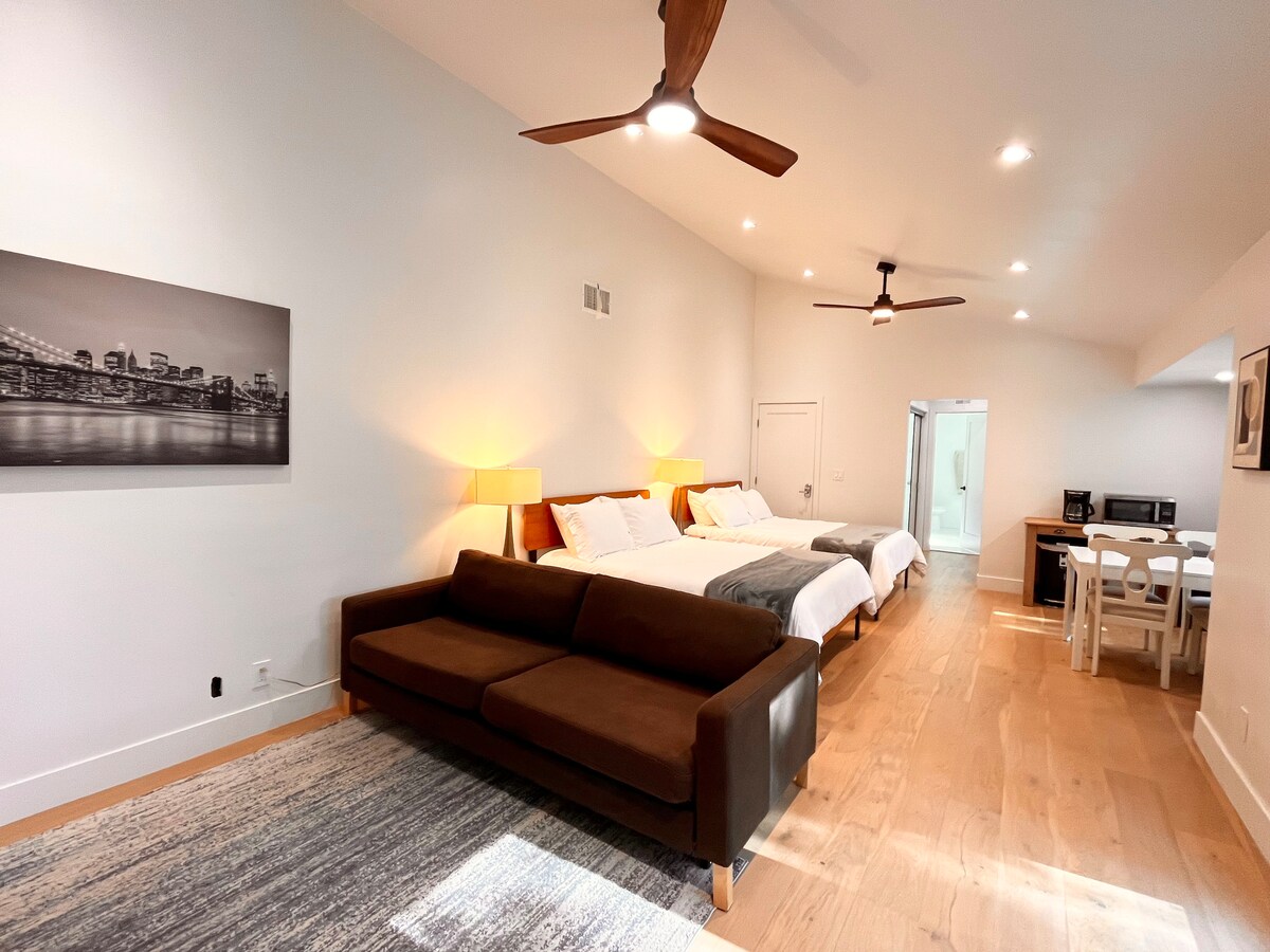 New studio in a quiet neighborhood, centrally located. Driveway parking. Private gated entrance with cemented walkway and private patio with table and chairs, with a BBQ. Stackable washer and dryer. 2-ton mini split AC and heater. 55" TV mounted with full swivel capability and 1 Gig internet. The sofa has a queen-size pull-out bed. The kitchen has a sink, electric stove, and microwave oven. The bathroom has a shower, toilet, and sink. Comfortable queen-sized double pillow top mattress.