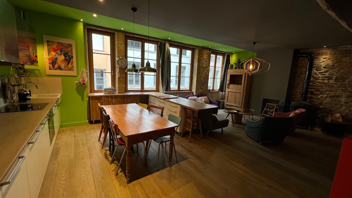 Nous vous proposons notre très bel appartement de cachet de 90m2, avec vue magnifique sur la Sâone, en cœur de ville, dans le quartier classé du Vieux-Lyon, à proximité à pied des sites touristiques. Idéal pour familles, couples, groupe d’amis ou collègues, vous aurez jusqu’à 8 couchages à disposition, ainsi qu’une grande table banquet avec batterie de cuisine pour vos diners ! Vous serez accueillis avec un cadeau d’arrivée (vin et pralines) pour commencer votre séjour !