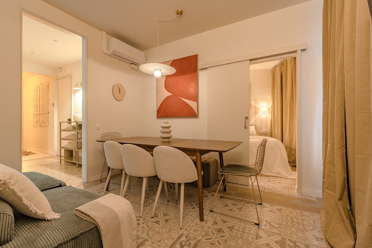 Charmante 110 m ² große Wohnung 🏡 10 Minuten von der Sagrada Familia 🏰 und dem „Barrio Gótico“ von Barcelona entfernt. Es befindet sich in der wunderschönen Nachbarschaft von Eixample und seinem exklusiven Garten, einzigartig in der Gegend, ermöglicht es dir, die Natur in deinem eigenen Zuhause zu genießen. Mit seinem Design und der heimeligen Note wird es deinen Aufenthalt unschlagbar machen Die Küche ist komplett ausgestattet 🍽 und das Wohnzimmer verfügt über einen 65-Zoll-Smart-TV 📺 mit allen Plattformen (Youtube, Netflix usw.). Kapazität bis 5 Gäste (2 in jedem Zimmer + 1 auf dem Sofa)