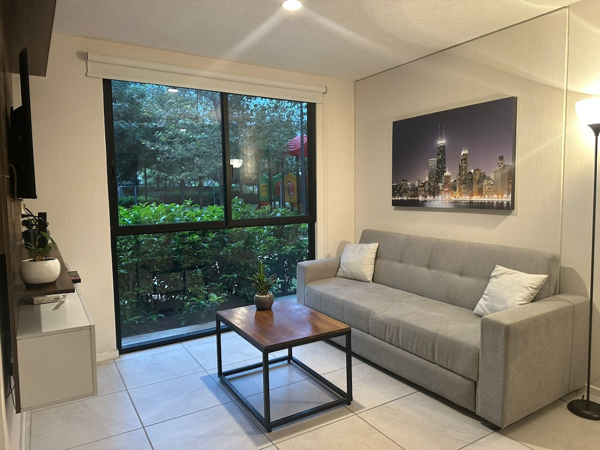 El departamento tiene para ti y tus acompañantes todo lo necesario para una estancia cómoda. Consta de una recámara Queen, clóset, baño, completo, Aire Acondicionado, pantalla y un acogedor balcón. Cocina equipada para preparar tus mejores platillos, sofá cama, que se convierte en cama Queen, pantalla de 65”, Internet de alta velocidad y una espectacular, terraza, perfecta para relajarse, tomar una taza de café, una copa de vino y contemplar la vista a los arcos del milenio y puente Matute Remus