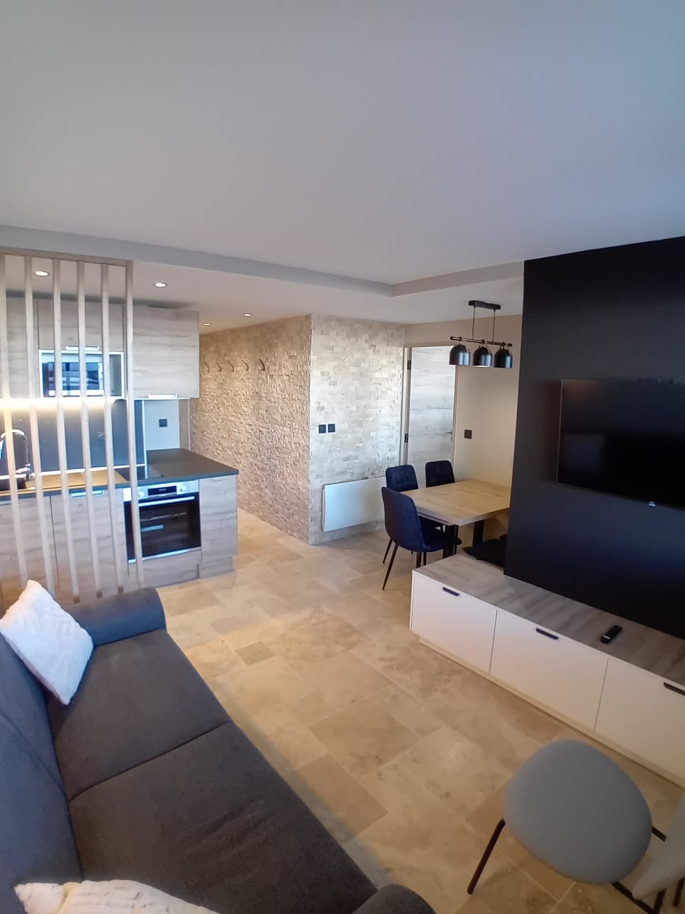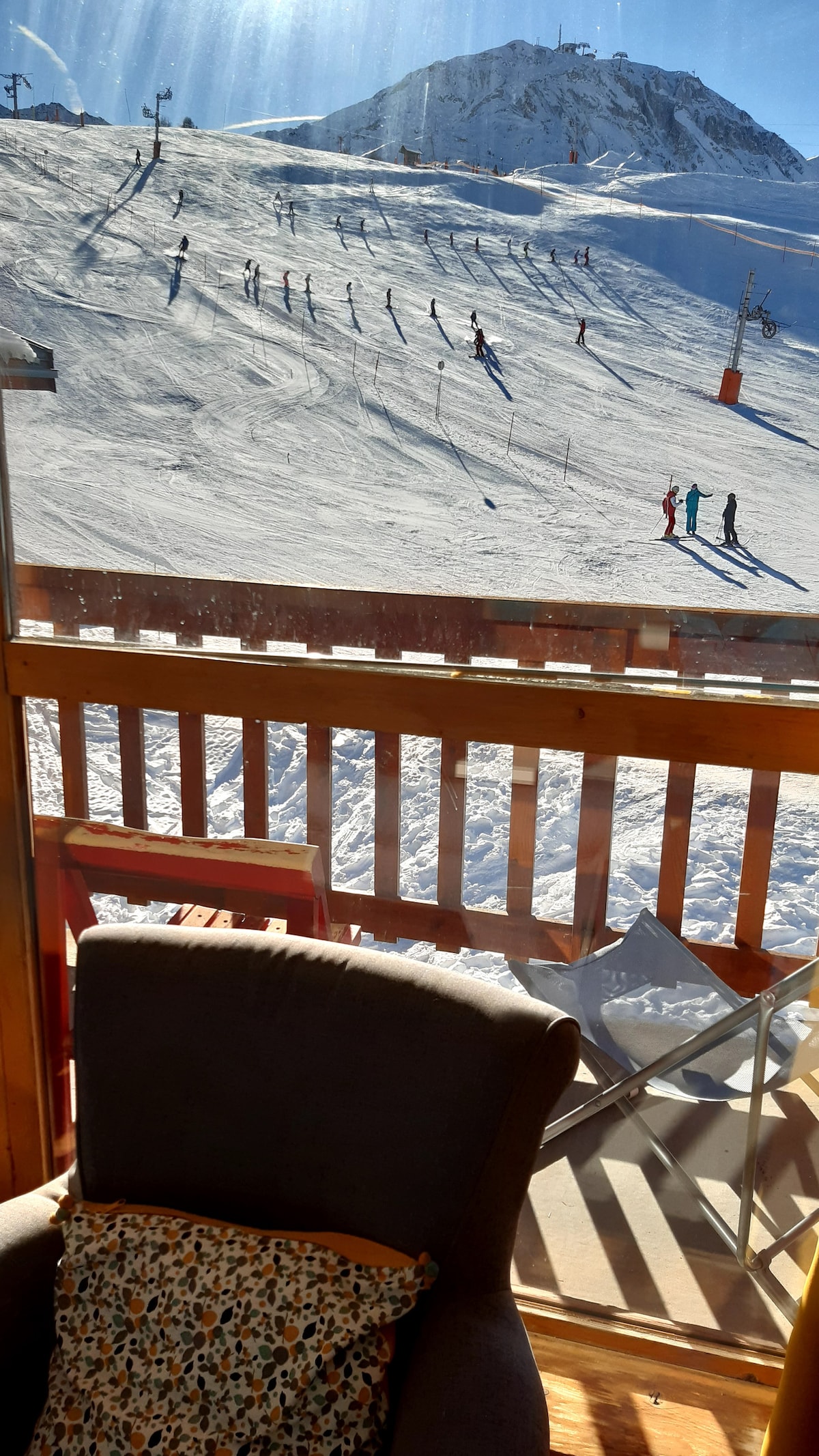 Die Wohnung verfügt über ein Wohnzimmer und ein Wohnzimmer mit einem Südbalkon mit Blick auf die Piste. Zwei Schlafzimmer, eines mit einem 140-Bett, eines mit einem 180-Bett, das in zwei 80 Betten getrennt werden kann. Ein separates WC, ein Bad mit Dusche, Eine ausgestattete Küche der Marke Schmitt. Komplett renovierte Wohnung im Jahr 2021: Ein Schlafsofa im Wohnzimmer; Direkter Zugang zu den 450 km Pisten Paradiski. abfahrt und Rückfahrt mit Skiern an den Füßen.