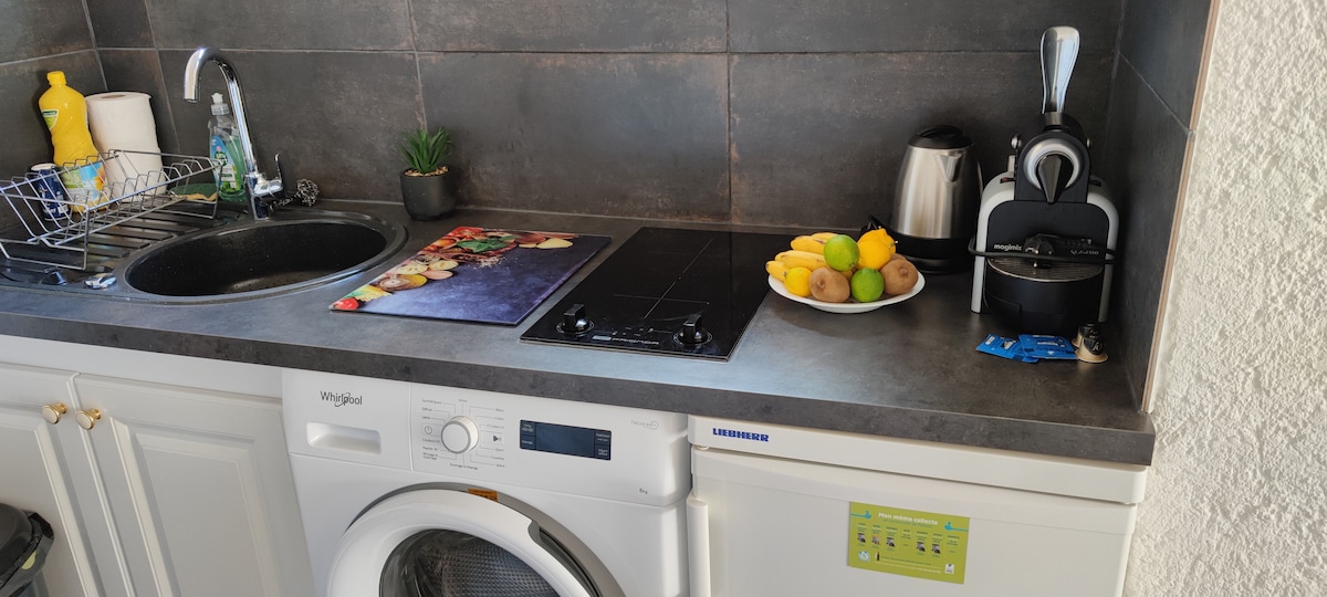 Logement refait à neuf spacieux et lumineux en sous sol de notre maison comprenant: - Une cuisine équipée avec four, micro-onde, plaque ,frigo, grille pain, cafetière, bouilloire, presse agrumes. Ainsi que tous les ustensiles necessaire. - Un salon avec un véritable canapé lit ( 140x 190 cm) et une télévision. Un authentique espace cocooning et chaleureux. - Une salle de bain avec douche et toilettes - Une chambre avec lit de 140x190 cm (matelas à mémoire de forme neuf ) avec télé et dressing.