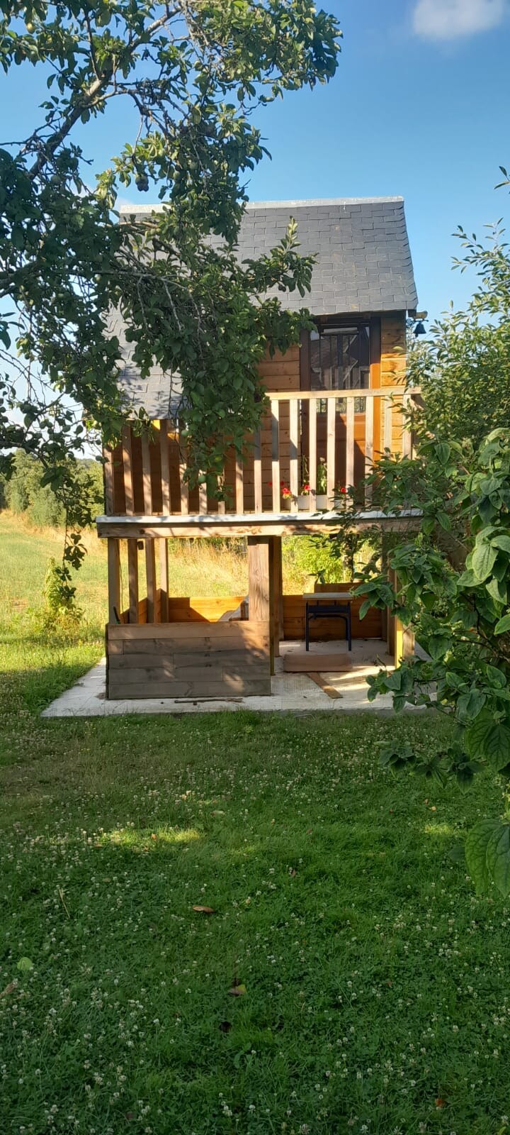 Notre logement situé sur un terrain arboré d'1 hectare au calme. Vous pourrez profiter des animaux, du labyrinthe végétal, de la tyrolienne Nous pouvons accueillir un couple avec un enfant, si celui ci ne mesure pas plus de 1m40. Le logement dispose d'un lit matrimonial (140x200) d'un lit enfant (160 x 60)et d'un lit de bébé (60x120 cm).