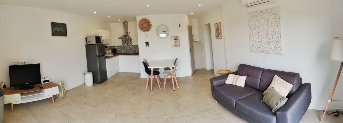 Situé sur une place charmante avec arbres et fontaine, l’appartement de 50m² est constitué d’une cuisine ouverte sur pièce de vie, d’une grande chambre, d’une petite salle de bain et WC séparé. Charme ancien avec des tomettes et un plafond “à la Provençale”. Deux couchages disponibles, pour un total d'accueil de 4 personnes (Chambre: un lit 2 places. Salon : un canapé-lit 2 places) A pied : lac à 10min, sites d'escalade à 20-25min, musée de Préhistoire à 5min :)