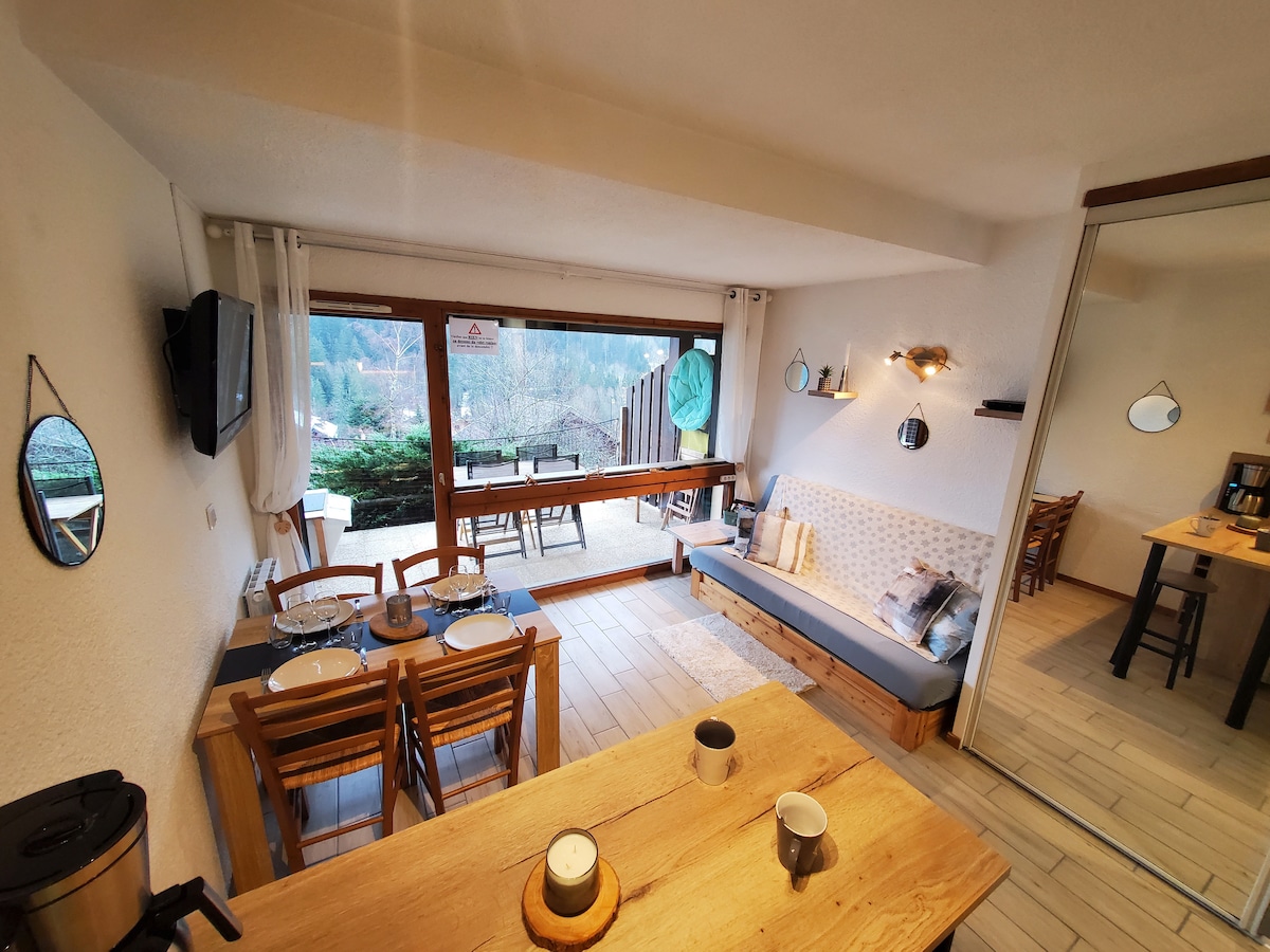 Machen Sie eine Pause und entspannen Sie sich in dieser ruhigen Oase im Herzen der Berge. Dieses wunderschöne renovierte Studio befindet sich im Goldenen Dreieck, weniger als 30 Minuten von Genf, 45 Minuten von Annecy und Chamonix entfernt. Sie haben Zugang zu den verschiedenen Außenbereichen sowie zu den nahe gelegenen Skigebieten: Les Brasses, Les Gets, Morzine, Châtel, Avoriaz, Samoëns. Vom 15. Mai bis 15. September ist der Außenpool zugänglich. Ideale Unterkunft für einen Aufenthalt zu zweit.