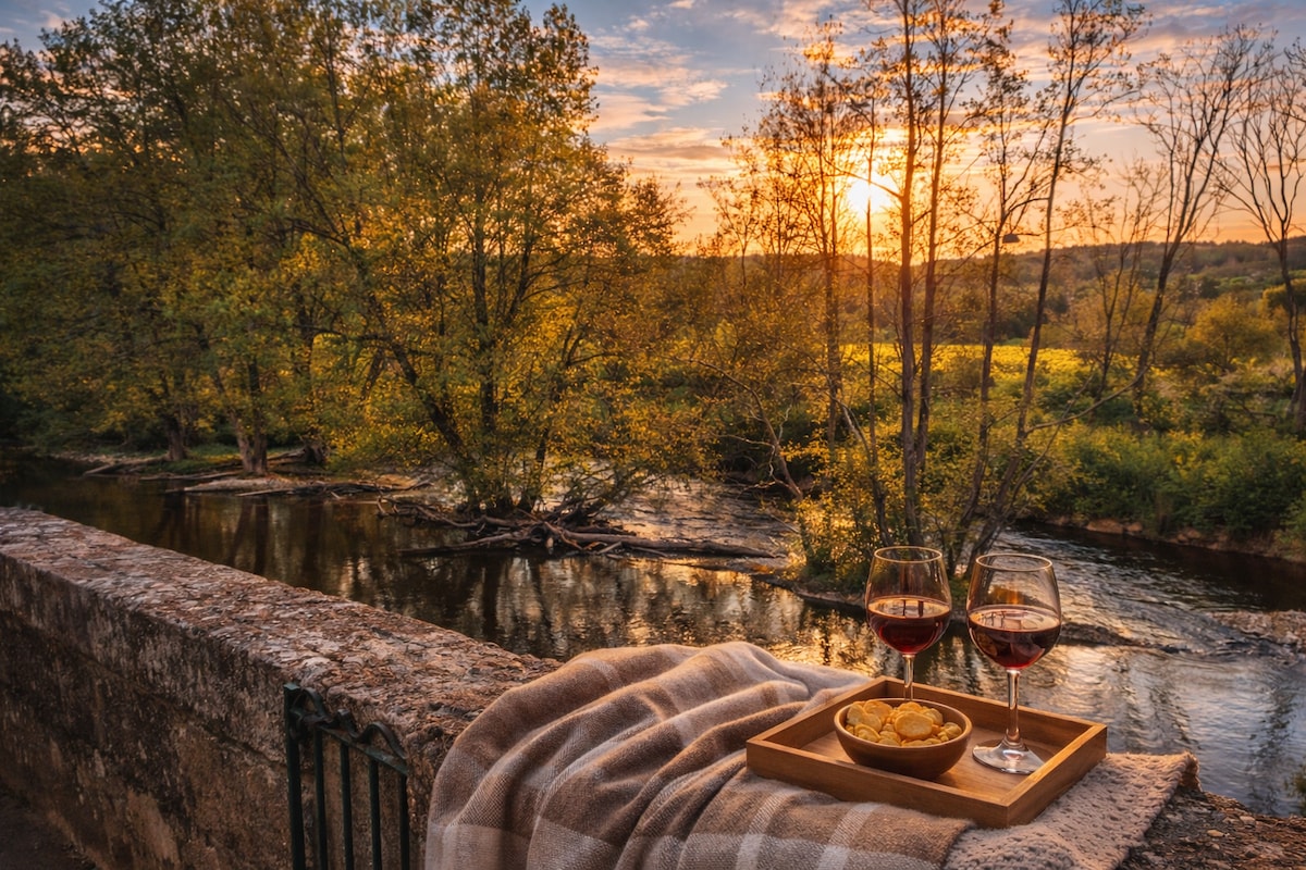 Abgeschiedenes Ferienhaus an einem Fluss unterhalb einer mittelalterlichen Stadt