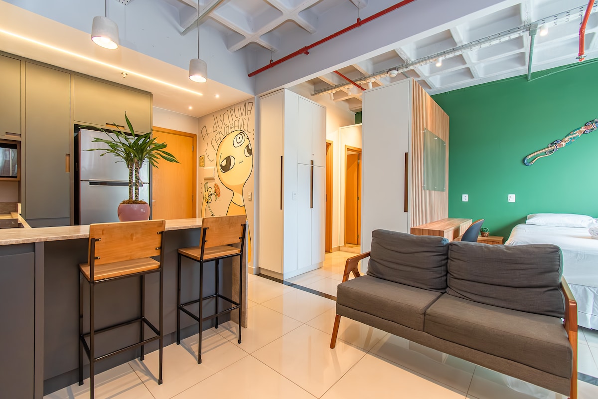 Ein anspruchsvolles, gemütliches Studio mit persönlicher Dekoration und Balkon auf 45 m². Alle Dinge für Ihren Aufenthalt. Klimaanlage, Smart-TV, WLAN, Geschirrspüler, Waschmaschine, Trockner, Weinkühlschrank, Mikrowelle. 24-Stunden-Rezeption, Wäscherei und ein überdachter Parkplatz. Außerhalb des Gebäudes Bäckerei für das Frühstück, Apotheke, ein Bistro, Fitnessraum. Markt in der Nähe von 200 m und andere gastronomische Optionen. Noroeste ist ein gehobenes Viertel in Brasília. Es ist 6 km vom Kongress entfernt. 23 km vom Flughafen entfernt.