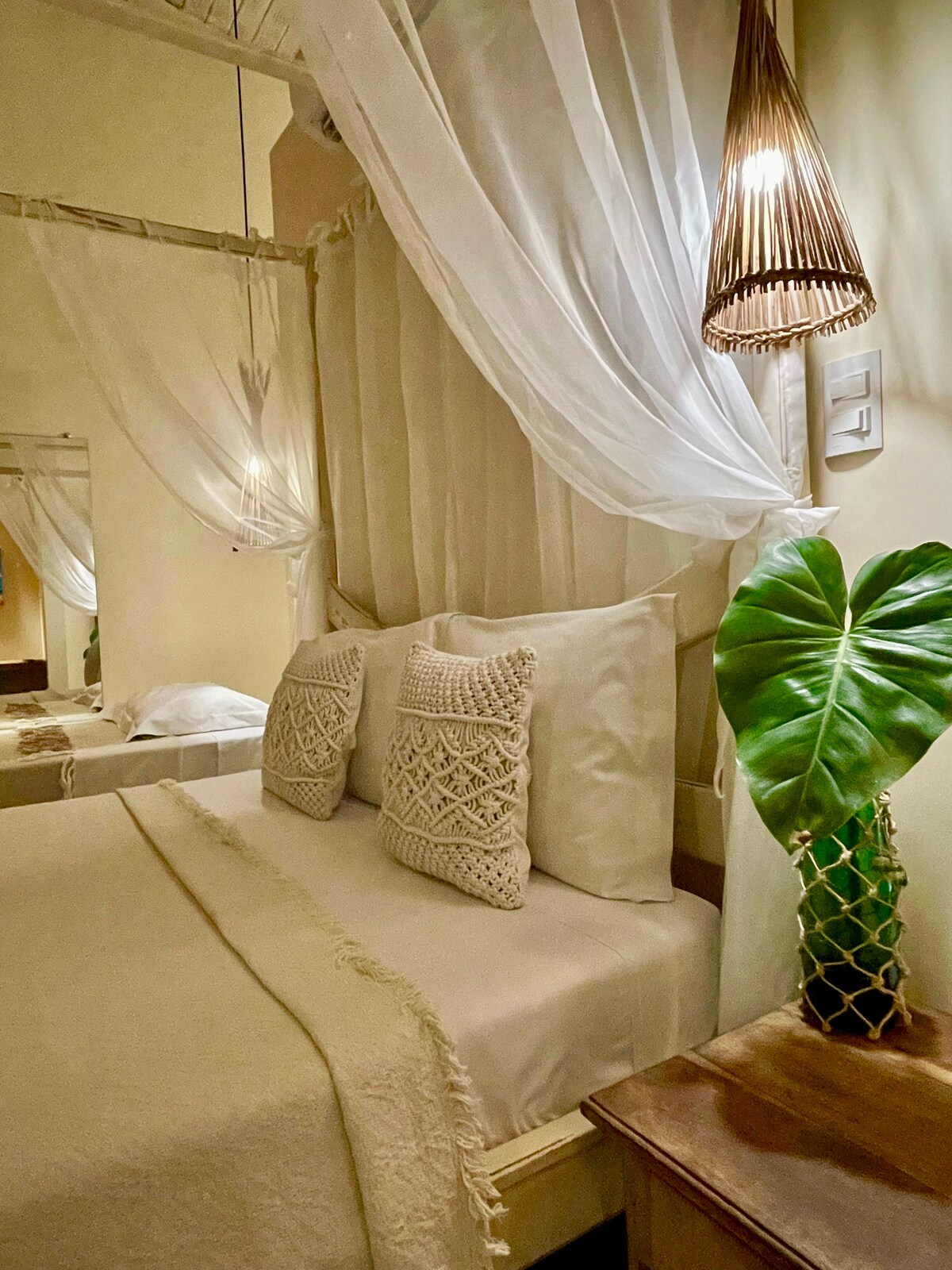 A Casa Céu reúne elegância, conforto e leveza em ambientes amplos, iluminados e naturalmente ventilados. A suíte oferece cama queen-size, ar-condicionado, closet, banheiro com chuveiro quente e um espaço exclusivo para trabalho. A cozinha espaçosa integra-se harmoniosamente a casa e a sala de jantar à noite ganha um clima romântico. O grande destaque é a área externa, com uma banheira rodeada por um lindo jardim perfeita para relaxar e se conectar profundamente com a natureza.