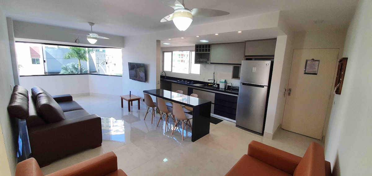 Bem localizado e seguro. É Rigorosamente higienizado c/ preservação da segurança e da privacidade das famílias. Apto 3 quartos, sendo 1 suíte c/ cama de casal, sala c/ cozinha americana, varanda c/ mesa, lavabo, 1 quarto com cama de casal, 1 quarto com 2 camas de solteiro, + 3 colchões extras , mesa de jantar com 6 cadeiras, sofá grande, ar condicionado nos 3 quartos, TV, fogão, geladeira, forno, mobília completa e área de lavanderia. Equipado p/ receber 9 pessoas (permitidos no condomínio)
