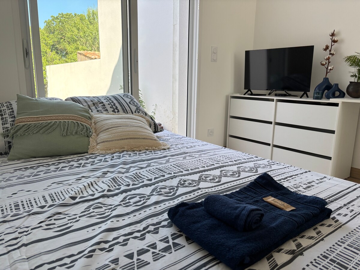 Wir bieten Ihnen einen ruhigen Aufenthalt in einer renovierten privaten Wohnung von 60m² im Erdgeschoss unseres Hauses, mit auch privater Terrasse. Die Unterkunft besteht aus 1 Schlafzimmer mit Doppelbett + 1 Schlafsofa im Wohnzimmer. Ideal für Paare allein oder mit einem Kind. Wir stellen Ihnen 2 Fahrräder zur Verfügung, um La Rochelle (10 Minuten vom Lebenslauf mit dem Fahrrad) und die Ile de Ré (30 Minuten von der Brücke entfernt) zu besuchen. Wenn Sie von Ihrem Tag zurückkehren, können Sie sich in Ihrer privaten Sauna (im Badezimmer) ausruhen.