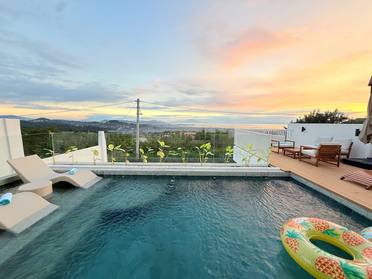 Escape and surround yourself with lush nature, natural hot spring swimming, and panoramic mountain views. Perfect for couples seeking an intimate staycation. This private getaway features an open loft design with a king sized bed overlooking the mountains, a wrap around sunken sofa with pool and garden views, a full kitchen, two full bathrooms, and a waterfall flowing with natural hot springs water