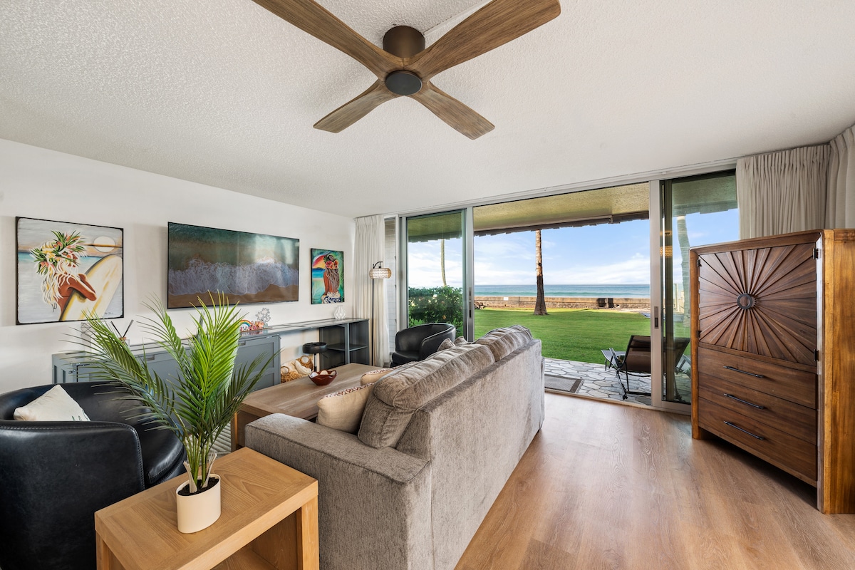 *Buchbar! Zum Glück befindet sich unsere Wohnung nicht im von den Waldbränden betroffenen Gebiet* Genieße atemberaubende Panoramablicke in dieser umgebauten Eckwohnung am Meer am Kahana Beach! Mit raumhohen Fenstern im Wohn- und Schlafzimmer kannst du sanfte Brisen und Sonnenuntergänge genießen, während du auf der Couch oder im Bett entspannst. Stell dir vor, du schläfst mit dem Rauschen der Meereswellen zu deinen Füßen ein und wachst mit spritzenden Walen im Hintergrund auf. Wahrlich eine Oase auf der Valley Isle.