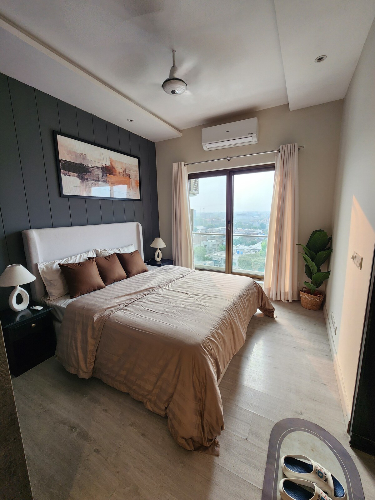 Diese Wohnung im „Japandi“ -Stil mit dem japanischen Minimalismus aus der Mitte des 20. Jahrhunderts vereint, verkörpert durch seine neutrale Farbpalette Einfachheit, Wärme und Balance. ✨USP: Der erste Designerraum seiner Art in Lahore, in dem jedes Element von erfahrenen Handwerkern handgefertigt wird. • Einzigartiges rundum gestaltetes Design, elegantes, farbenfrohes Dekor, um deinen Aufenthalt gefühlvoll zu machen, nicht langweilige und stilvolle Möbel, die sowohl für Komfort als auch für Ästhetik durchdacht wurden.