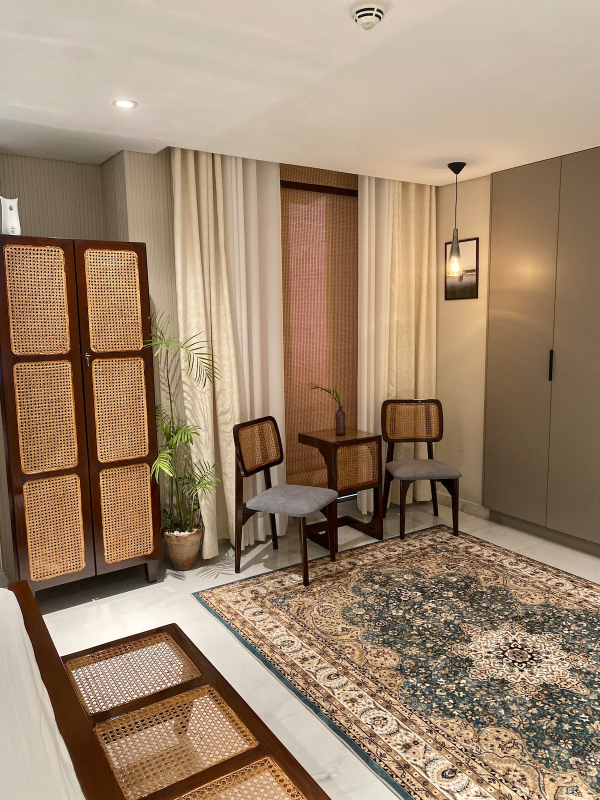 Thoughtfully styled with authentic cane heritage furniture, this apartment carries the quiet poetry of old Lahore warm textures, soft light, and a nostalgia you don’t have to explain. It’s not just a stay, it’s a feeling. Located right on MM Alam Road, you’re surrounded by Lahore’s most vibrant cafés, restaurants, and boutiques—yet inside, it feels calm, grounded, and gently removed from the noise. A blend of heritage charm and urban convenience