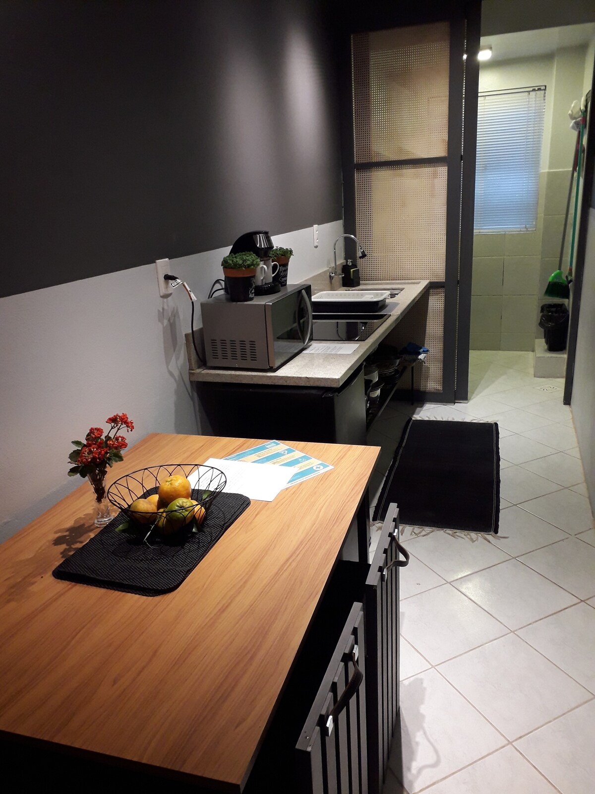 Apartamento completo no centro da cidade, para até 2 pessoas. Ideal para quem busca praticidade, boa localização e um espaço aconchegante para descansar. O espaço • Até 2 hóspedes • Cozinha equipada • Máquina lava e seca • Cafeteira • Micro-ondas • Refrigerador • Roupa de cama e toalhas • Secador de cabelo Entretenimento • Netflix e YouTube Localização • No centro • Próximo a mercados, farmácias e restaurantes Facilidades • Papel higiênico • Garagem no prédio • Check-in com cofre para chaves