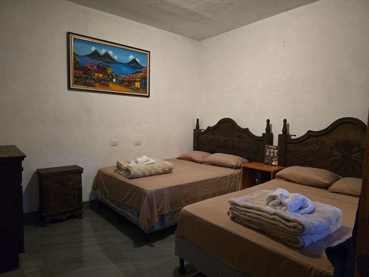 Übernachten Sie in einem geräumigen Zimmer mit zwei Doppelbetten, ideal für 2 bis 4 Personen. Inklusive kostenlosem Frühstück auf der Dachterrasse mit spektakulärem Blick auf den See und die Vulkane. Genieße einen 24-Stunden-Service, eine engagierte Rezeption und moderne Räumlichkeiten, die für deinen Komfort gestaltet wurden. Das Zimmer verfügt über eine Kaffeemaschine mit Kaffee und Tee, kostenloses Wasser, einen Haartrockner und ein eigenes Bad. Perfekt für Familien oder Gruppen, die Komfort und ein einzigartiges Erlebnis in Panajachel suchen.