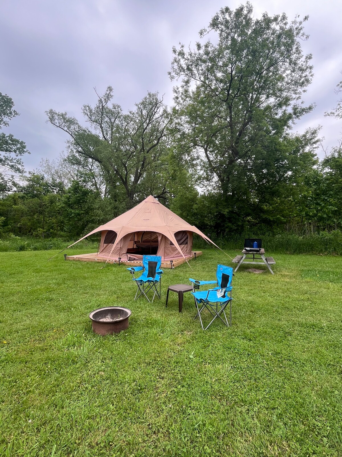 Entfliehe und bleib unter den Sternen. In deinem privaten Glamping-Zelt. Genieße eine gemeinsame holzbefeuerte Sauna und einen Whirlpool, gefolgt von einem kalten Sprung. Nur 45 Minuten nördlich von Toronto bieten wir eine Erholung vom Trubel. Wenn die Nacht hereinbricht, versammle dich um ein Knistern, eine Feuerstelle, tausche Geschichten aus und lache unter dem Sternenhimmel. Wenn kulinarische Inspirationen auftreten, steht dir eine Gemeinschaftsküche zur Verfügung, die alle notwendigen Werkzeuge zur Verfügung stellt, um eine köstliche Mahlzeit unter freiem Himmel zu kochen.
