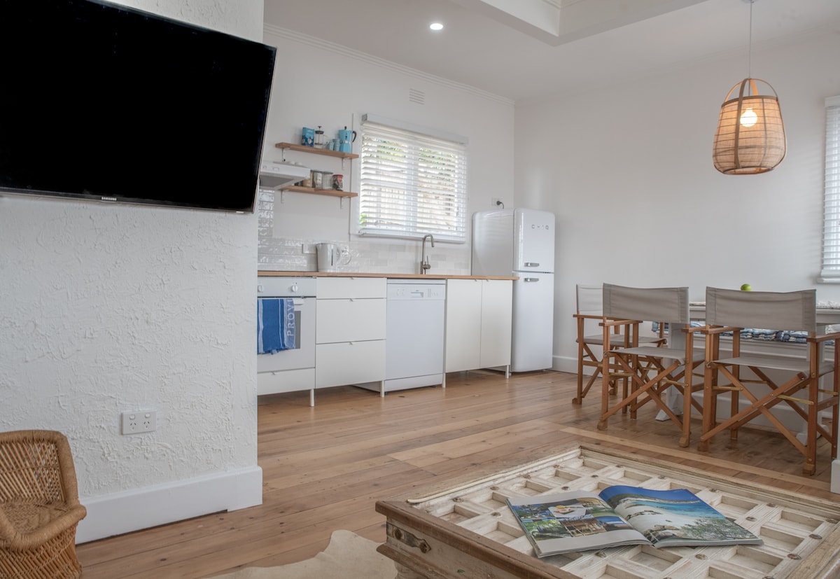 Nach einer 2-jährigen Pause sind wir zurück! Ein Studio im Boutique-Stil mit dem Luxus eines Massagestuhls! Nur wenige Gehminuten vom Surfstrand, neuem Café, Fish & Chips, Geschäft und Waschsalon entfernt ~ 20 Minuten zu Fuß von den Haupteinkaufsstraßen und Restaurants ~ kurze Fahrt zur Walbeobachtungsplattform und zur Pferderennbahn. Eine Küchenzeile, ein eigenes Bad und ein privater Innenhof ~ separater Eingang vom kostenlosen Parkplatz vor Ort ~ Queensize-Bett + Doppelschlafsofa ~ Platz für bis zu 4 Personen. Ideal für Singles, Paare, kleine junge Familien oder Mädchen-Wochenende. Kostenloses Frühstück und Toilettenartikel