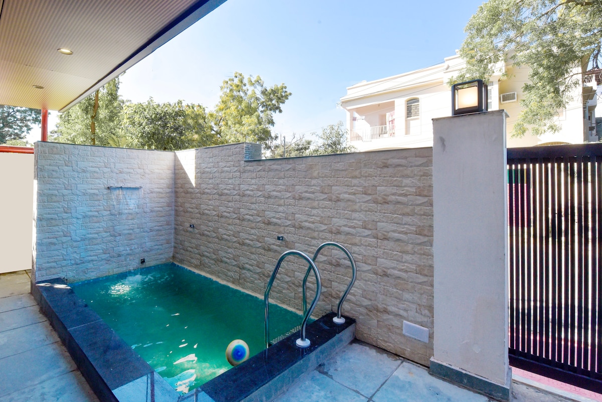 Bringen Sie die ganze Familie und Freunde zu diesem tollen Ort mit viel Platz für Spaß. - Alle großen Zimmer sind mit einem 55-Zoll-Fernseher ausgestattet. - Geräumige, saubere und schön eingerichtete Innenräume - Ein Zimmer mit privatem Swimmingpool von 225 sqft - schnelles WLAN & Smart-Fernseher - voll ausgestattete Küche mit Grundausstattung - Warmwasser und Klimaanlage rund um die Uhr - Privater Balkon - Einfaches und sicheres Parken - Badezimmerausstattung - Biotique Perfekt für Paare und Familien, die eine stilvolle, ruhige und gut angebundene Unterkunft suchen.