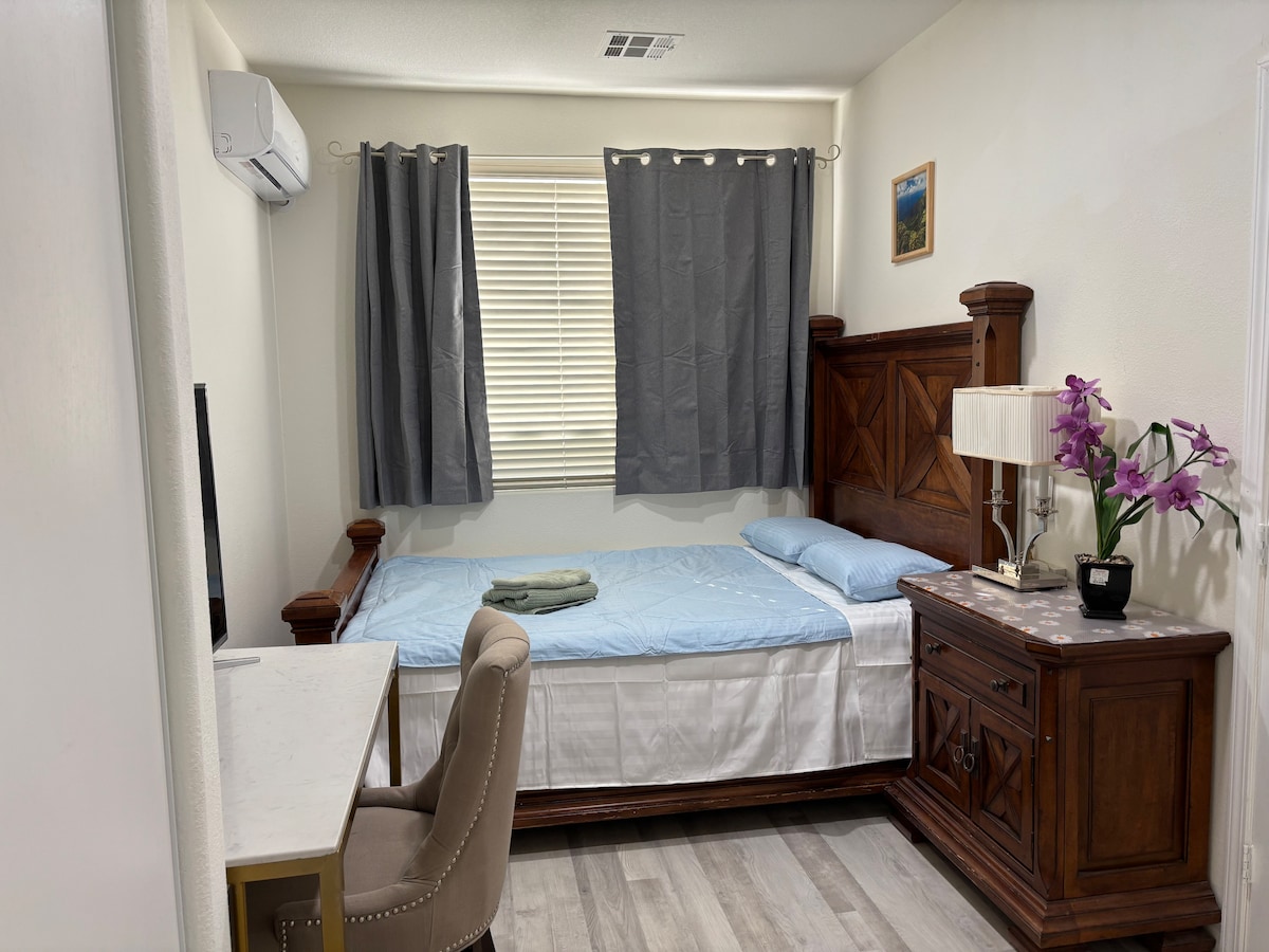 Your beautiful 1-bedroom private suite awaits, featuring a studio kitchen, private full bathroom, dining table, games, workspace, cozy living room with coffee bar. Relax in your private oasis with a beautiful backyard, big pool (3-10ft deep) and heated spa. Perfect to unwind after a thrilling day in Vegas. Suitable for a romantic getaway, family trip, or solo vacation! Book now and experience your ultimate vacation! Enjoy total privacy with a separate entry and no host interaction.