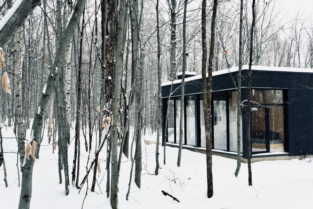 Cosy timeless chalet conceptualized by the architects of _naturehumaine. Nestled into the cliffside at an altitude of 490 meters (1600 feet), its unique design is distinguished by boldness and originality and fits with harmony in its environment. Surrounded by forest, the cottage offers breathtaking views of Mount Glen and the surrounding nature largely protected by the Appalachian Corridor. The perfect silent place to relax and unwind. Photo: Adrien Williams / S.A. CITQ #302449