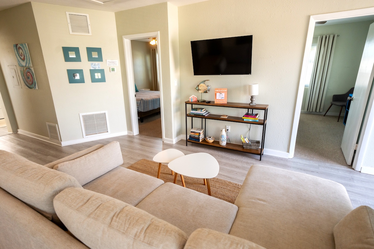 Construction upgrades complete! 30 second walk to gorgeous beach with amazing sunsets and miles of beachfront. Tucked away on a quiet street, a hidden gem away from busy condos. 1 of 3 units in a small villa on the beach side. Walk to restaurants 2 bedrooms King beds, 1 with 2 Twins (this room has W/D). Blackout curtains & comfy mattresses Super comfy new sofa. Beautiful well equipped kitchen Beach towels, chairs & cooler. Washer/Dryer in unit, central AC, Wi-Fi, free parking in front.