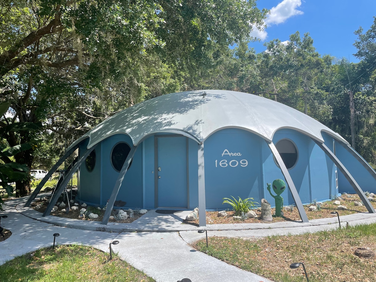 Greetings and welcome to your Alien Dome Retreat, nestled among majestic oak trees. Discover a retro-futuristic arcade loft, a cozy living space with cosmic décor, and a firepit for stargazing under the vast night sky. There are many spaced themed artifacts, board games and a record player. Explore local nature trails, fish nearby waters, and immerse yourself in a unique blend of earthly comfort and extraterrestrial allure in Area 1609. 🛸🌌