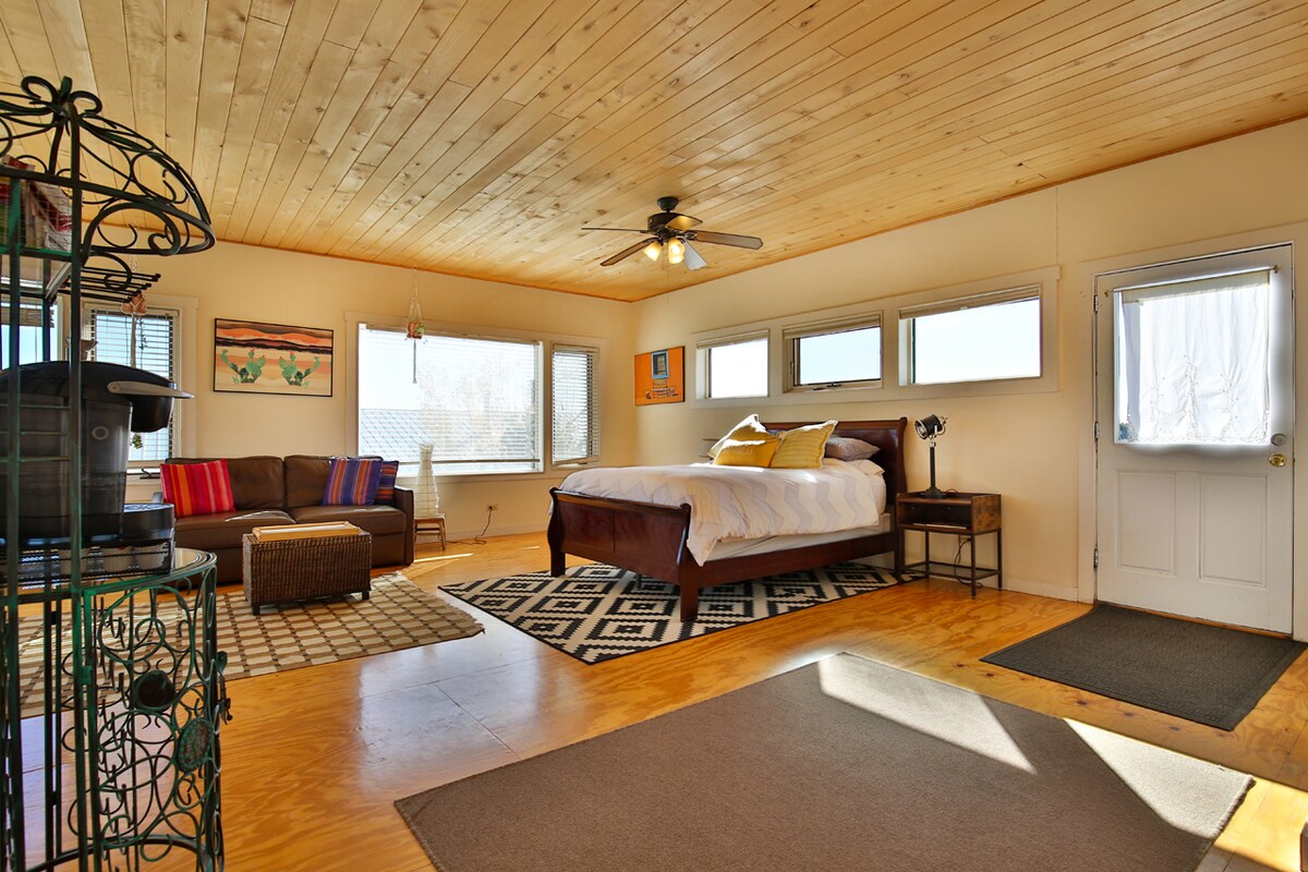 Diese helle und hübsche Suite bietet einen atemberaubenden Blick auf den Taos Mountain im Norden und eine geräumige Terrasse mit Blick auf die südliche Bergkette. 10-12 Minuten zum Taos Plaza und eine direkte Verbindung zum Taos Ski Valley in 25 Minuten. 6 Fuß tiefe Badewanne zum Genießen! Roku TV hat Netflix, Hulu, Amazon. Küchenzeile, Kaffee und Tee werden bereitgestellt. JA, dieses Studio verfügt über starkes WLAN, das Zoom-Arbeitstreffen unterstützen kann. Sie ist am Haupthaus angebaut. Reinigungsprotokolle werden eingehalten. Ruhe dich aus, erneuere dich und genieße!