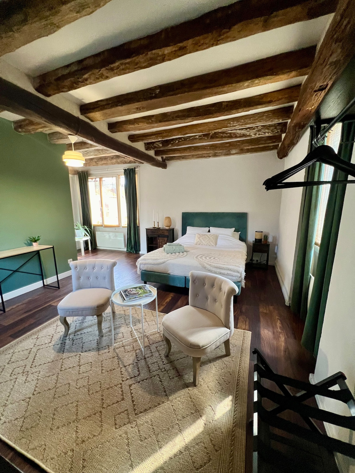 Die Unterkunft ist eine ganze Etage eines unabhängigen Hauses. Es besteht aus einem Schlafzimmer, Bad und WC, die Sie alleine benutzen können. Im 1. Stock bietet das Haus eine weitere unabhängige Suite. Geteilte Küche im Erdgeschoss. Sie haben einen unabhängigen Zugang zur Straße über den Garten, in dem Sie Ihre Fahrräder abstellen können. Freuen Sie sich auch auf eine Terrasse für ein sonniges Frühstück. Das Haus stammt aus dem 17. Jahrhundert und bewahrt die ursprünglichen Elemente.