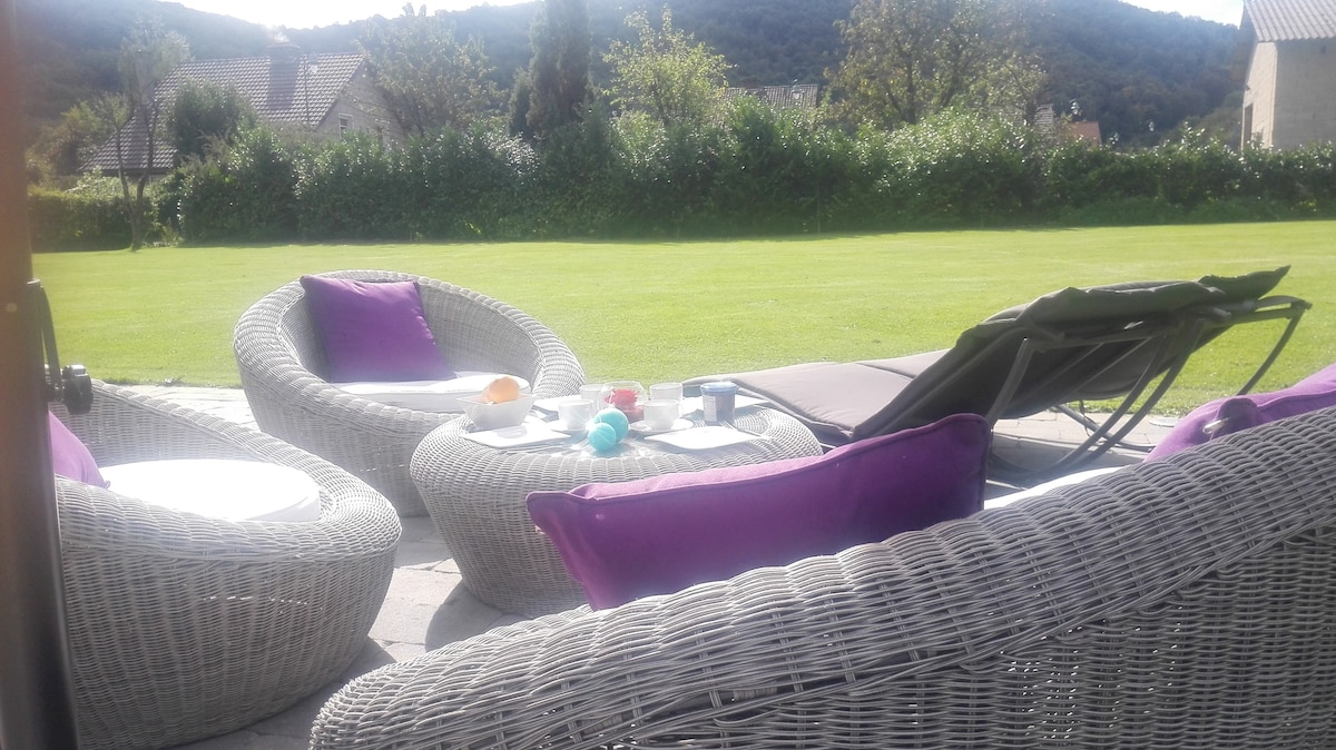 Pleasant, luxury, warm, comfortable cottage, surrounded by nature with a beautiful view of the Ardennes, large private garden with swing, private parking in front of the house. New high speed wifi. Last house at the top of a pretty little village, on a dead end road, 150 m from the forest. Perfect for walks. For 2 adults and possibility of 1 child and 1 baby. 1 hour 15 minutes from Brussels, Liège, Lux. 4km from the Meuse valley. Tennis!! under construction. Spa pool 15' Golf 12'..