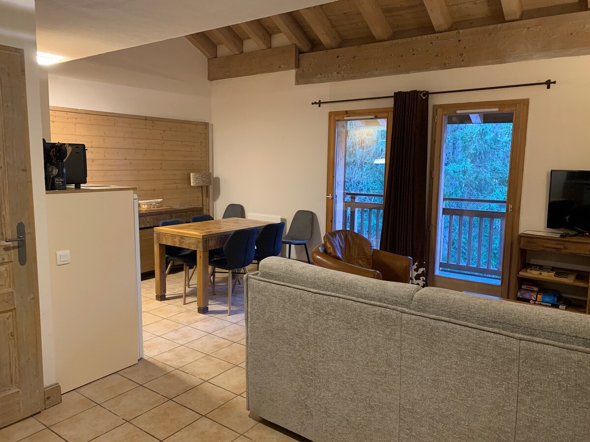 Our Bellecote apartment is approximately 45m2, has two bedrooms, is south facing and has a small private balcony with views towards mountains and forest. There is also a large wooden balcony with stunning views to the north towards Mont Blanc and the surrounding mountains. The piste is accessible at the end of our garden! Our jacuzzi and sauna are available between 17-20h30 and reservable for private use. Ideal for families and couples OCCUPANCY MAX 4 ADULTS + 1 SMALL CHILD <10 YRS
