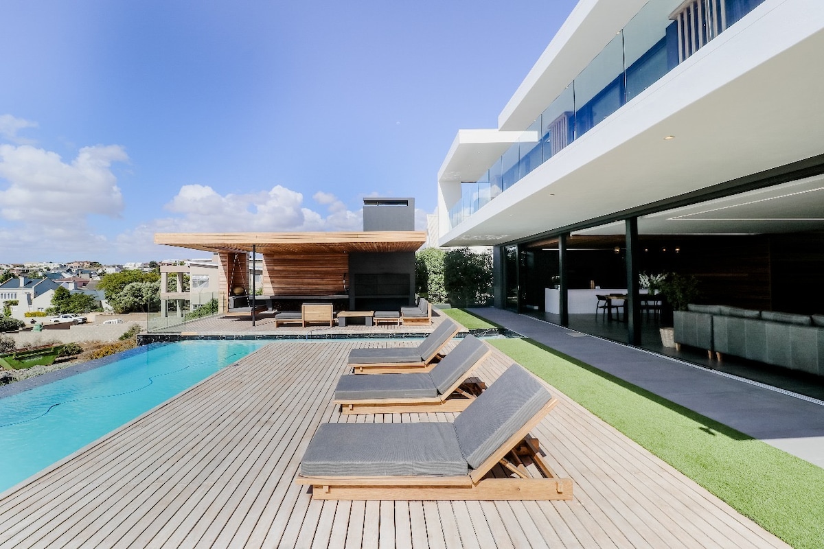 Die Villa Oasis ist ein luxuriöses architektonisches Refugium mit Blick auf die Lagune von Langebaan. Sie wurde als immersive Oase konzipiert und verfügt über kaskadierende Wasserfälle, üppige tropische Gärten, einen Wasserfallpool, eine Sonnenterrasse, große Unterhaltungsmöglichkeiten im Freien und im Innenbereich, 3 luxuriöse Schlafzimmer mit eigenem Bad, einen privaten Fitnessraum, einen eigenen Büroraum und eine vollständige Hausautomation mit maßgeschneiderter Beleuchtung. Dieses tropisch inspirierte Refugium verbindet hochmodernes Design mit ruhigen Ausblicken auf die Küste und bietet ein unvergessliches 5-Sterne-Erlebnis inmitten der Natur.