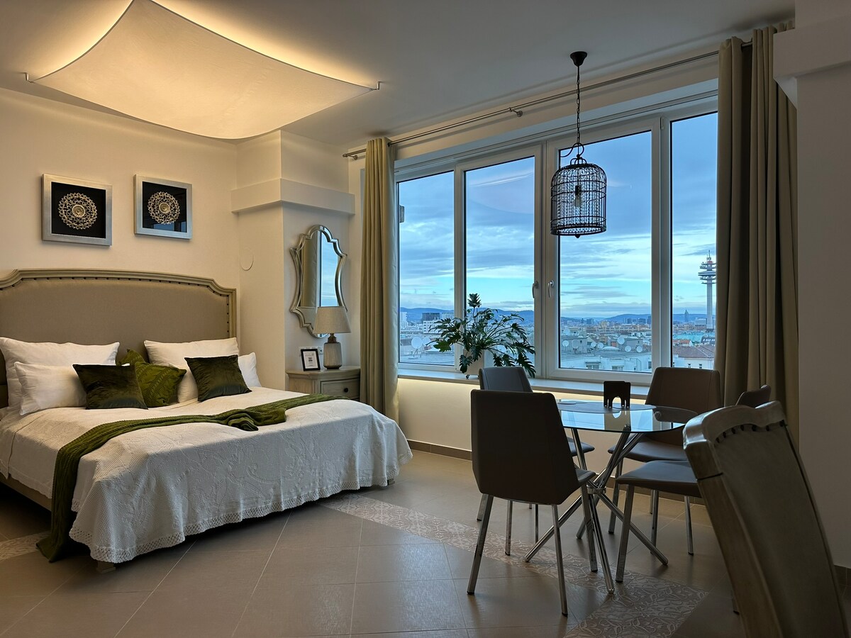 Ein garantiert erstklassiges Erlebnis mit Blick auf die wunderschöne Wiener Skyline. Das luxuriöse 55 m² große Apartment im 24. Stock mit einem zusätzlichen 10 m² großen Balkon macht Ihr Wien Erlebnis unvergesslich. Ihr Aufenthalt inkludiert herausragende Leistungen wie einen Concierge-Service, eine Bibliothek und Lounge, einen Dach-Pool, einen Garten, einen Supermarkt und Restaurants auf dem Gebäudegelände mit direkter U-Bahn-Anbindung in die Innenstadt von Wien in 10 Minuten.