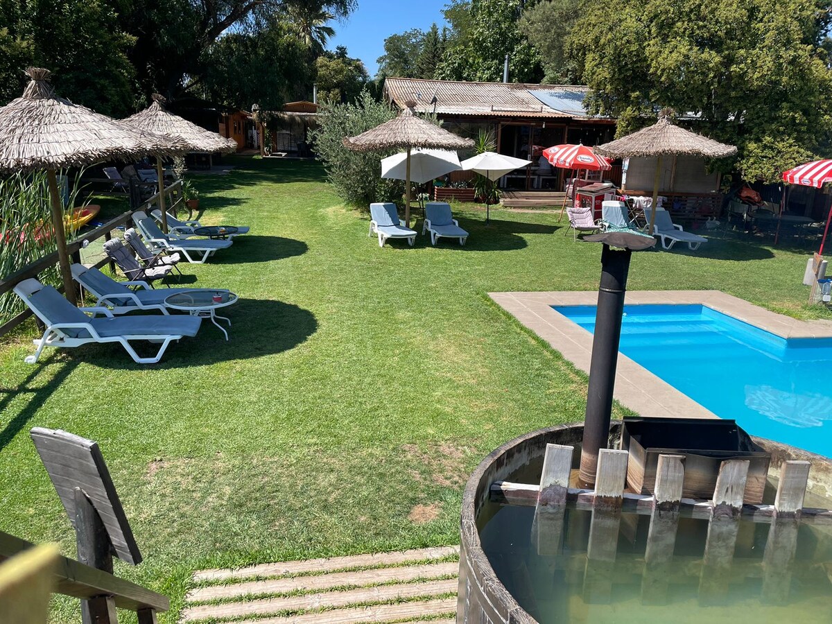 Entspanne dich mit der ganzen Familie in dieser ruhigen und schönen Unterkunft. Unsere Anlage verfügt über 4 Blockhütten für Familien von 6 und 4 Personen. Es ist ideal zum Entspannen und Ausruhen, hauptsächlich ruhige und familienfreundliche Umgebung. Isoliert durch Geräusche kannst du einen schönen Blick auf den See genießen. (See nur im Sommer, Mitte März ohne See) Gemeinschaftspool und 6 Stunden Nutzung von Tinajas kostenlos. Wir haben einen kleinen Dock- und Kajakabstieg.