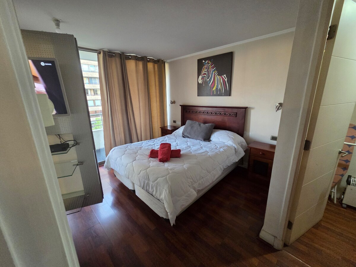 Diese Wohnung ist ideal zum Entspannen und Genießen der Stadt. Es ist zentral gelegen, zwischen den Bezirken Santiago Centro und Providencia, einer der besten Standorte der Stadt. Es bietet eine wunderschöne Aussicht auf den Hügel San Cristóbal und den Sky Costanera. Sie ist nur 3 Gehminuten von der U-Bahn und den Bussen entfernt. Enthält: Kostenloses WLAN, eine voll ausgestattete Küche, Bettwäsche und Handtücher inklusive, ein großes Bett mit einem großen Smart-TV. Selbstbedienungseingang mit einem Schlüssel, sodass du jederzeit anreisen kannst.