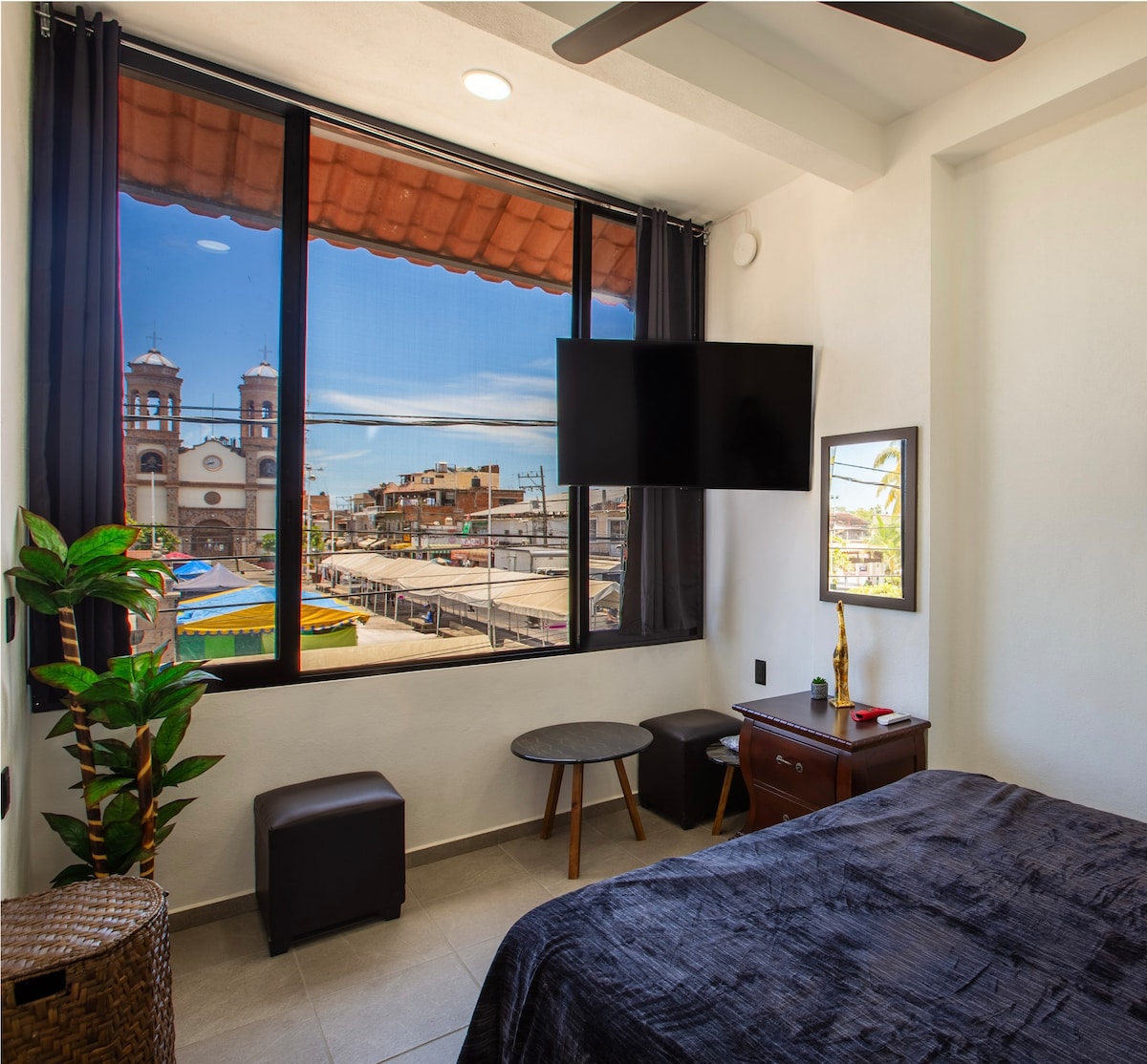Trainiere in einem Fitnessstudio und blicke durch raumhohe Fenster auf eine Stadt und eine Bergkulisse. Schwimme im Infinity-Pool auf der Dachterrasse, während die Sonne untergeht. Zurück in der Wohnung gibt es einen schönen Balkon mit vielen interessanten Kunstwerken im Inneren. Dies ist eine Eigentumswohnung mit einem Schlafzimmer und zwei Badezimmern. Das Wohnzimmer verwandelt sich in ein Queensize-Bett. Bettwäsche sowie Handtücher und grundlegende Toilettenartikel werden bereitgestellt. Bei deiner Ankunft wirst du vom freundlichen Gebäudepersonal empfangen. Sie zeigen dir die Wohnung und führen eine Besichtigung durch. Sie zeigen dir alle Annehmlichkeiten, die die Eigentumswohnung zu bieten hat. Falls du während deines Aufenthalts Unterstützung benötigst, stehen dir die Mitarbeiter an der Rezeption zur Seite. Die Eigentumswohnung Navila ist nur wenige Gehminuten vom Strand und dem Fluss sowie von vielen Boutiquen entfernt. Die Romantische Zone verfügt auch über die höchste Konzentration an Restaurants und Bars in der Stadt, mit einem lebendigen mexikanischen Flair, das sich auf den Straßen fortsetzt. Zu Fuß ist die beste Art der Fortbewegung, aber du kannst ganz einfach ein Taxi oder ein Uber direkt vor dem Gebäude erhalten. Busse fahren etwa zwei Blocks entfernt (also kein Buslärm).