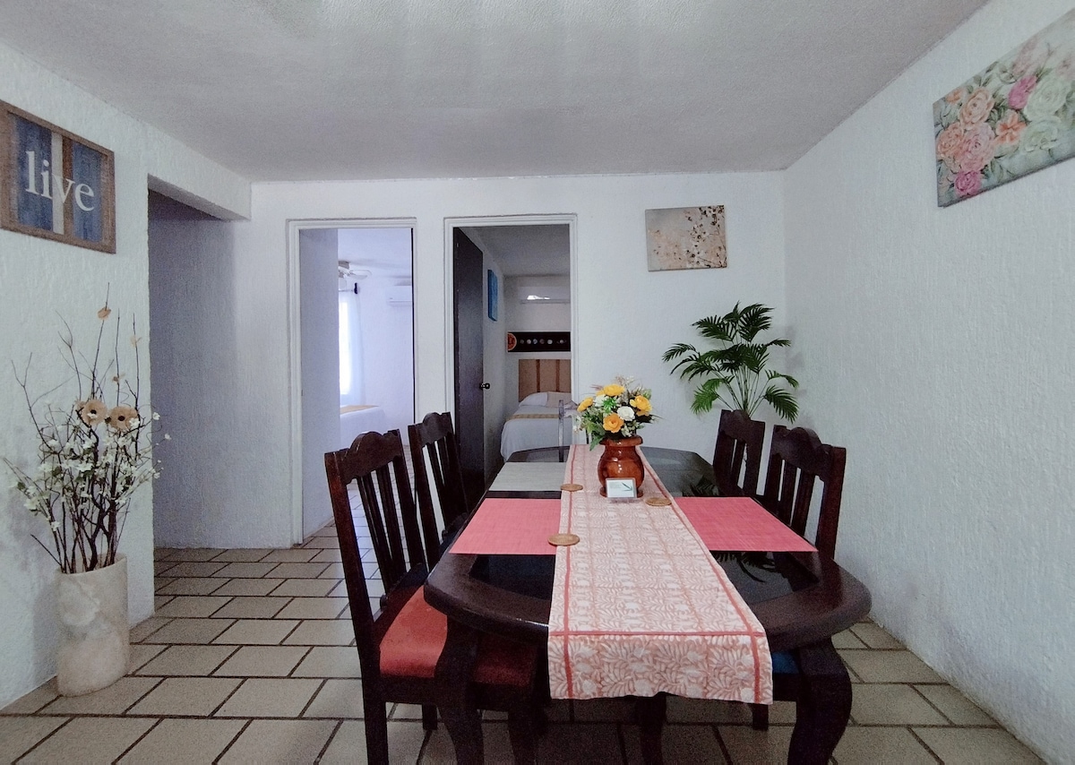🌞 ¡Vive unas vacaciones de ensueño en Cancún! 🌴 Lugar perfecto para todos: 🧑‍🤝‍🧑 Adultos | 💑 Parejas | 👶👧Familias |🎉 Amigos Departamento en zona tranquila ✔ 10 min al centro | 12 min a Zona Hotelera Incluye: 2 Recámaras (3 camas y A/A) • Amplio Comedor • Sala • Cocina 100% equipada • Cuarto de lavado • Balcón • Estacionamiento 🚶‍♂️Cerca de: 🛍️ Mall Las Plazas Outlet Cancun 🏧Supermercado: Soriana y Chedraui Selecto 🏪Minisúper: Oxxo, Go Mart 🚏Transporte público a zona hotelera