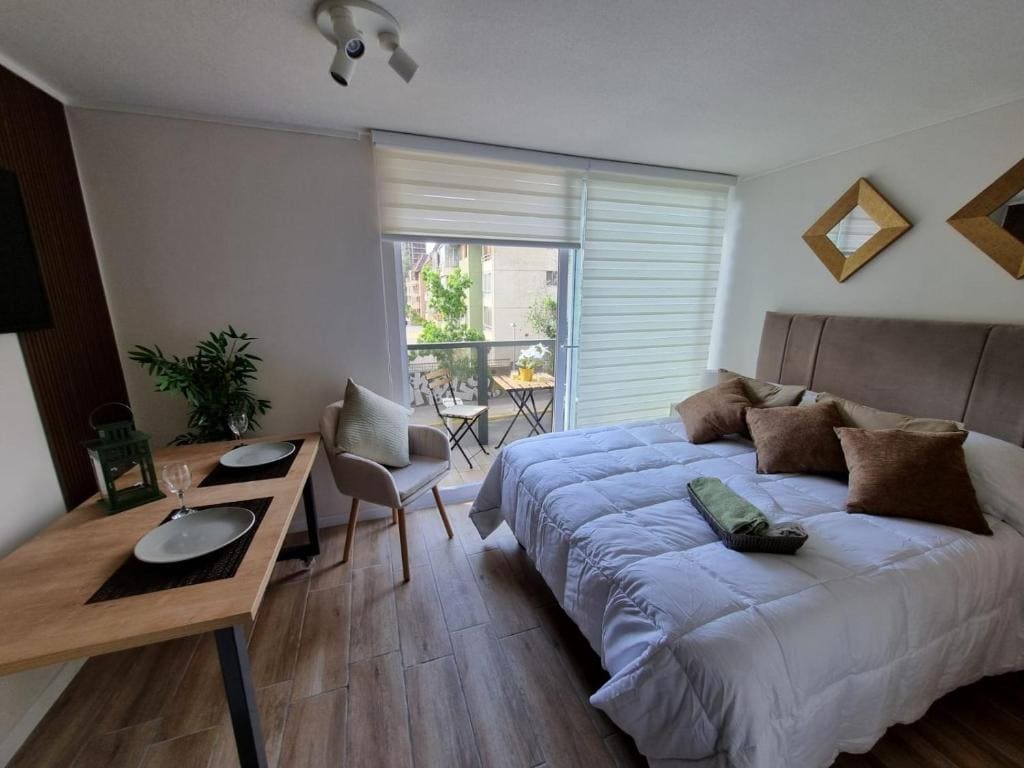 Furnished apartment with excellent location near supermarkets , just 1 block from the Santa Lucia Metro and 20 minutes walk from downtown Santiago, excellent connectivity and access. With separate room, bathroom en suite, two Smart TV, kitchen, oven. Work area with desk plus lamp and chair with excellent speed wifi. Terrace to smoke or enjoy the outside Air Conditioning INVERTER 12000 BTU. - supermarket just blocks away. - Café just 300 metres away. - Cerro Santa Lucia at only 800 meters.