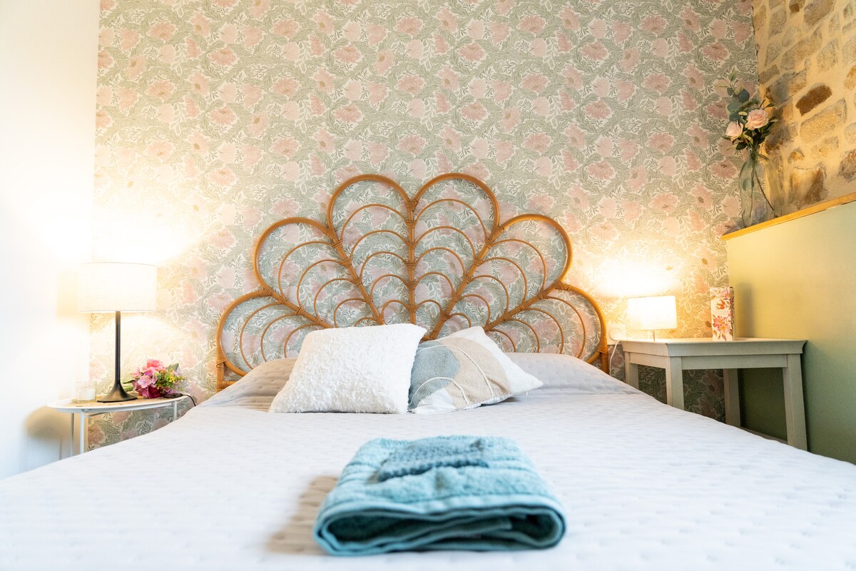 Wir begrüßen Sie in unserem Steinhaus am Ende des Blumengartens, im blauen Zimmer. Das Zimmer befindet sich im Obergeschoss unseres Steinhauses und verfügt über einen Schlafbereich mit einem Doppelbett, einen kleinen Schreibtisch, ein eigenes Badezimmer mit einer großen Duschkabine und WC. Für Ihren Komfort stellen wir Bettwäsche und Handschuhe zur Verfügung. Das hausgemachte Frühstück. Im Erdgeschoss im Wohnzimmer serviert, werden frische, biologische und lokale Produkte geehrt.