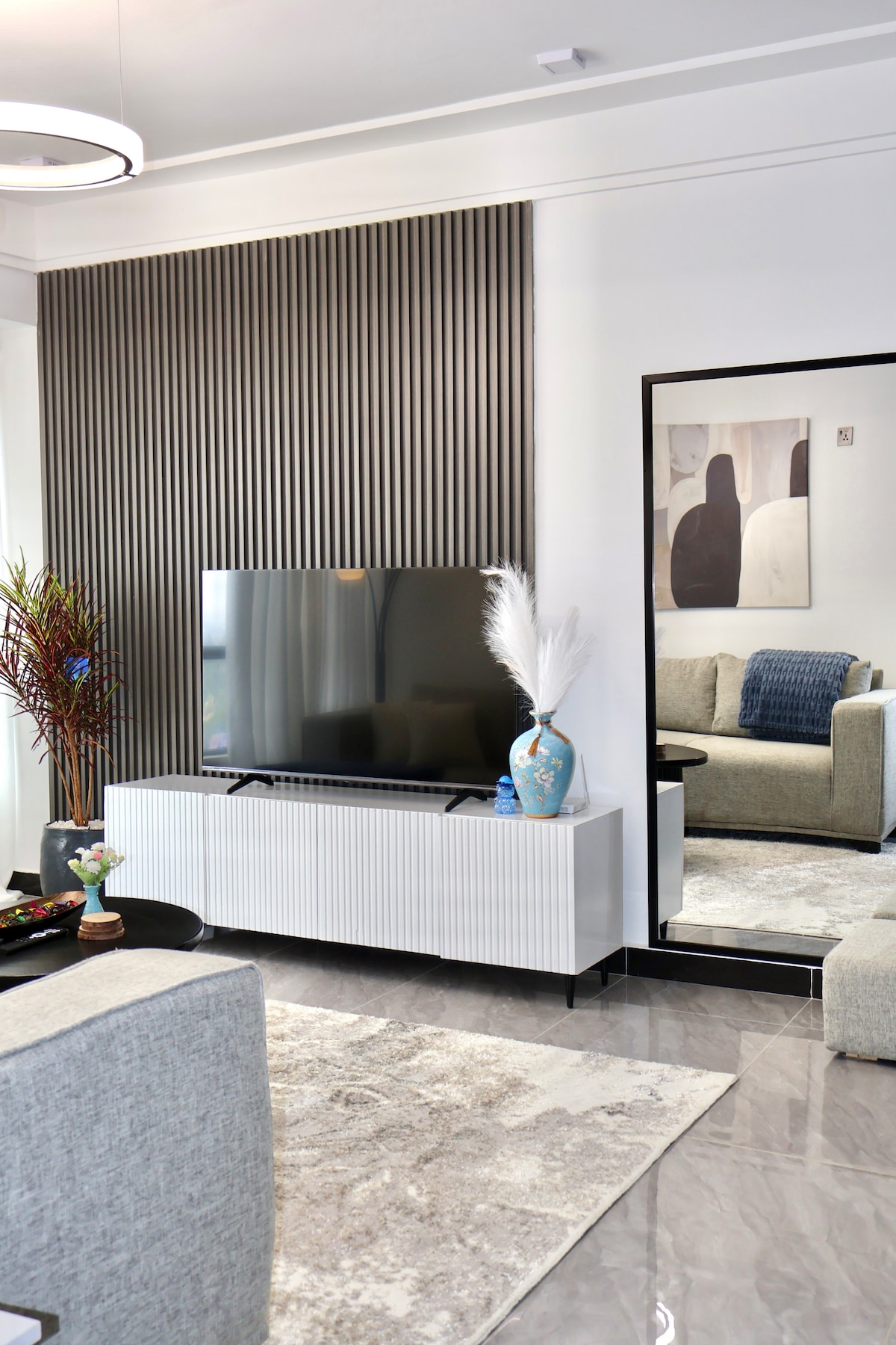 Ein ruhiger, stilvoller Rückzugsort im Herzen von Kilimani. Diese durchdacht gestaltete Wohnung verbindet warme Erdtöne, sanfte Beleuchtung und natürliche Texturen, um einen gemütlichen, modernen Aufenthalt zu schaffen. Entspannen Sie sich im sonnendurchfluteten Wohnzimmer mit seinem rostfarbenen Sofa und kuratierter Kunst, genießen Sie Mahlzeiten im eleganten Essbereich oder kochen Sie in der voll ausgestatteten Küche. Entspanne dich abends in einem ruhigen Schlafzimmer. Perfekt für Alleinreisende, Paare oder Familien, die Komfort, Stil und Bequemlichkeit suchen.