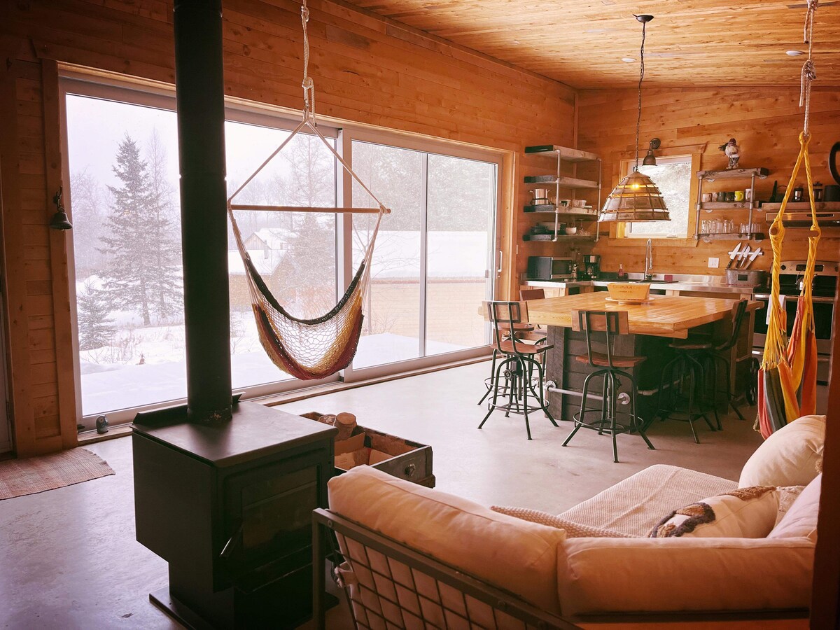 Der perfekte Ort, um sich ohne Schuld zu entspannen! Die 16’ lange Glastür gibt das Gefühl, jederzeit draußen zu sein; auch wenn es regnet oder schneit, aber in Komfort und Wärme. Sommer: Für Rafting- oder Kajakfahrer auf dem Fluss Mistassibi oder Wandern entlang des Flusses. Zugang zu kleinen Buchten, um zu baden oder die Stromschnellen zu bewundern. Winter: Genießen Sie die Schneeschuhwege. In der Nähe der Schneemobilwege La Passerelle du 49e parallel.