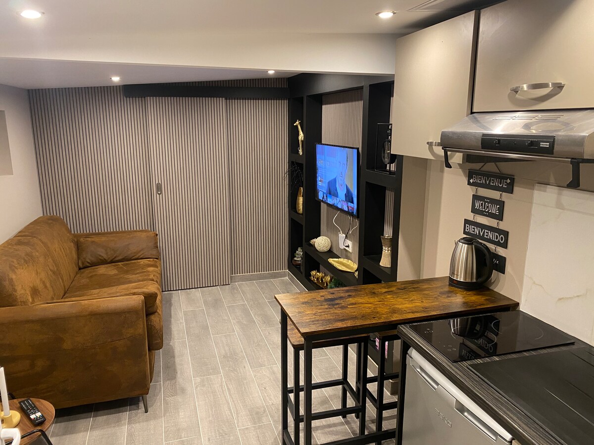 Duplex rénové, attenant à la maison des hôtes, avec une magnifique vigne vierge sur la façade, comprenant : - une cuisine tout équipée pour 2 personnes (Nespresso, Tassimo et cafetière filtre a disposition) - une chambre avec un lit double 140, et un canapé fixe (non convertible), un coin bureau et TV. - une salle de bain avec baignoire et douche. Proche tous commerces (à pied) : bar/tabac, épicerie, boulangerie, supermarché, restaurants, cinéma, bowling.