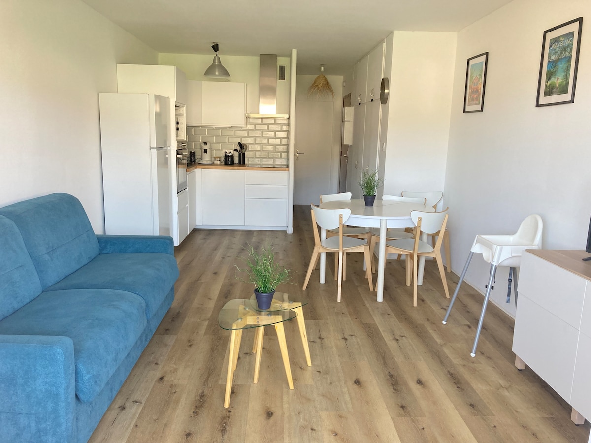 Renovierte Wohnung am schönen und langen Strand von La Bergerie Mit Blick auf das Meer, Füße im Wasser direkt am Strand, begrüßen Sabine und Sébastien Sie in ihrem schönen modernen Kokon. Wahre Oase der Ruhe für Liebhaber des Meeres, Sie werden es nicht aus den Augen lassen und können den Sonnenaufgang über den Îles d'Or von Ihrem Bett aus genießen. Gemütliche und herzliche Atmosphäre, die Wohnung und ihre Terrasse von 27 m2 befinden sich am Ende der Residenz für mehr Privatsphäre.