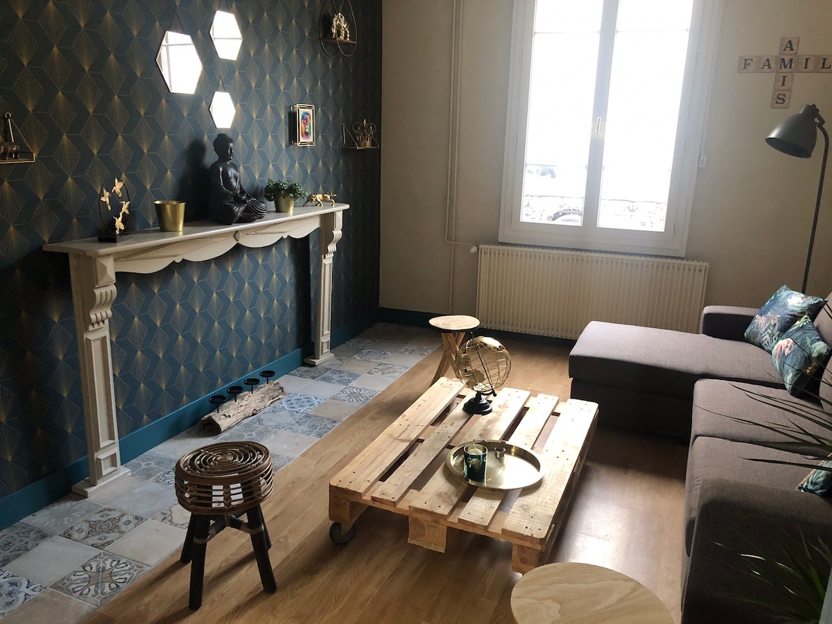 Charmantes gemütliches Haus von 80 m2, in dem wir bis zu 6 Personen beherbergen können, ganz in der Nähe des Bahnhofs, mit einem Innenhof, der mit einer anderen Unterkunft geteilt wird. Das Haus besteht aus: • im Erdgeschoss: eine ausgestattete Küche, Bad mit WC, Esszimmer und Wohnzimmer mit Schlafsofa (feste Unterstützung) • im Obergeschoss: zwei aneinandergereihte Schlafzimmer mit 1 Bett 160 cm, ein Futonbett 160 cm mit High-Density-Matratzenauflage und einem Schreibtisch.