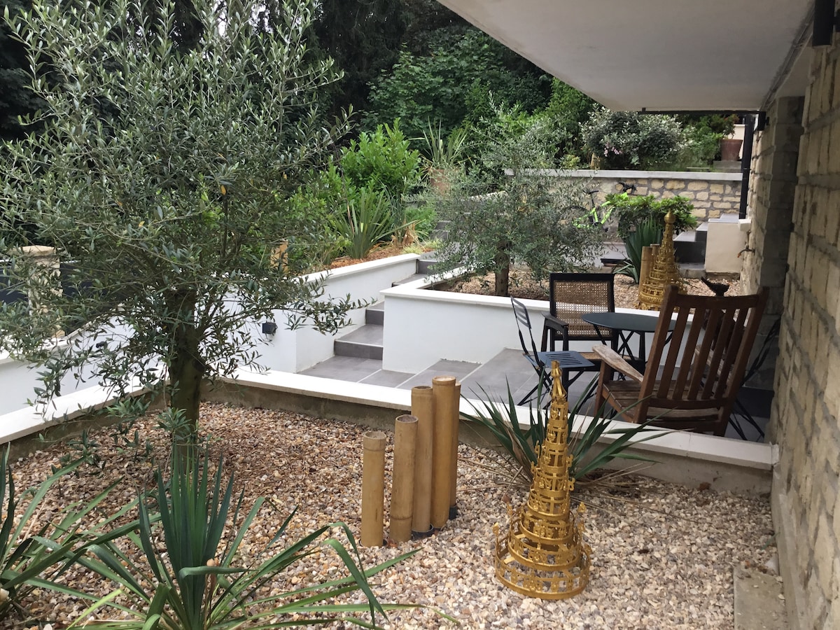 Charmantes Studio in ruhiger Lage nur für Sie, rund um einen Garten weit weg vom Lärm 🔇 und Stress der Stadt 🚉 Schneller Zugang mit dem Zug nach PARIS 11 Minuten vom Arc de Triomphe (Avenue des Champs-Élysées) Station „Charles de Gaulle Étoile“ 7 Minuten bis „La Défense“ (rer A und SNCF J L) 🚶🏻♂️Bahnhof 11 Minuten mit dem Bus oder 18 Minuten zu Fuß von der Unterkunft entfernt Das Studio ist hell mit Blick auf den Garten mit seinem Efeu, der eine bukolische Atmosphäre schafft.