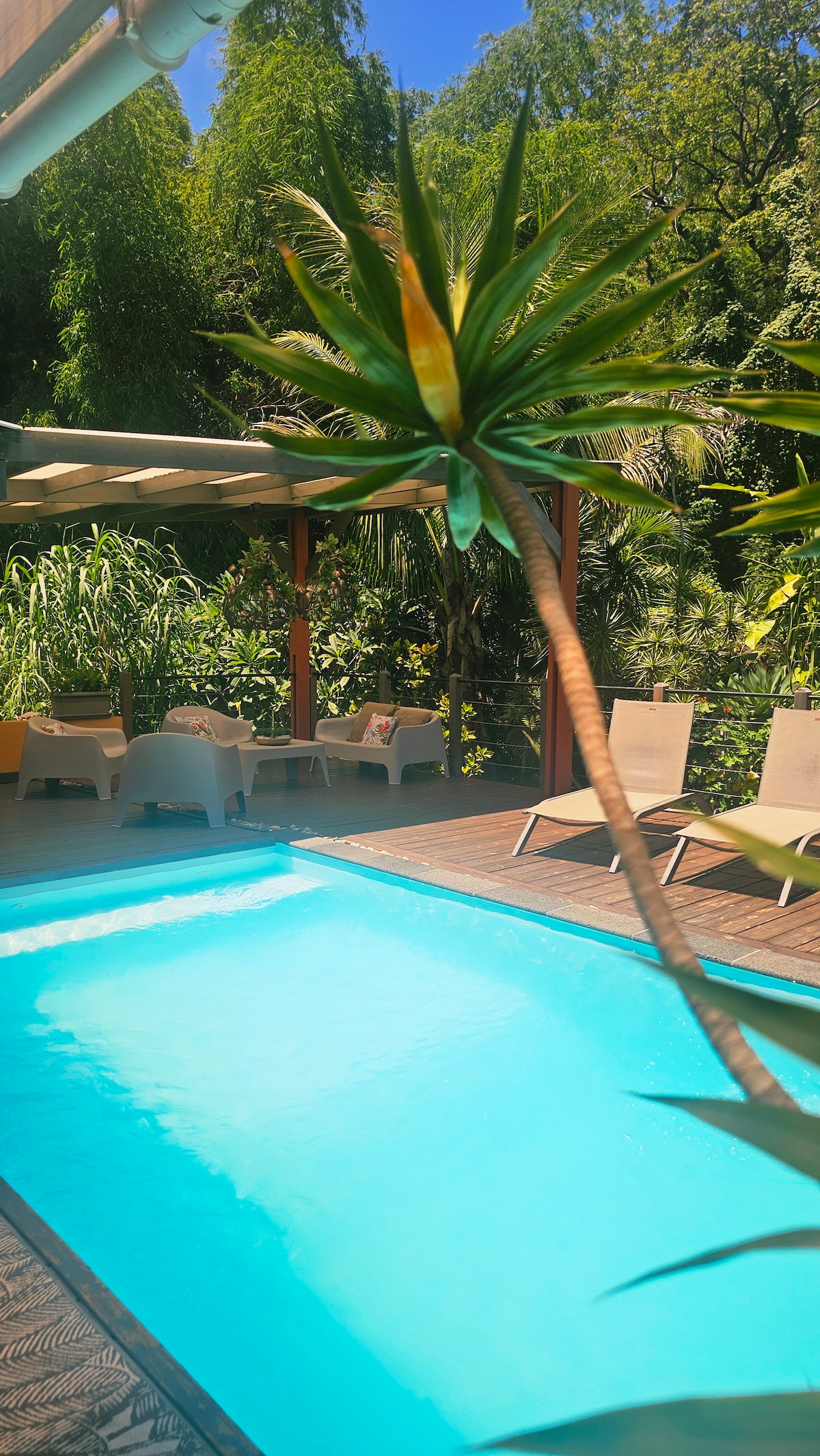 In einem schönen geschlossenen kreolischen Garten von 1000 m2 (Litschis, Longanis, Avocados, Vanille, Mangos, Pitaya, Kokosnuss ...) erwachen Sie mit einem herrlichen Blick auf die Berge in einem brandneuen Bungalow aus einheimischem Holz mit eigenem Eingang und mit Charme eingerichtet. Auch in einem 30°C warmen Natursteinschwimmbad können Sie das ganze Jahr über entspannen und relaxen.