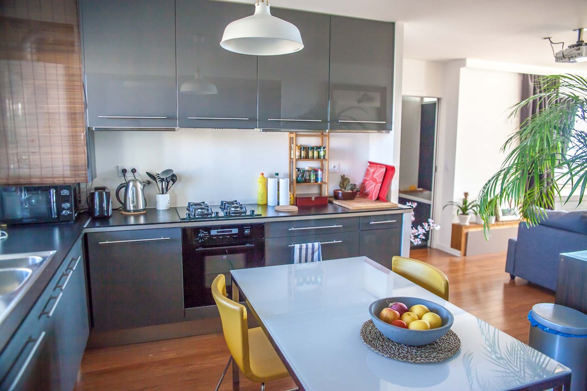-Grand salon / salle à manger de 45 m2 - 1 chambre de 11 m2 - salon et chambre climatisé - Douche italienne - Cuisine tout équipée (plaque induction, lave-vaisselle, hotte, four, micro-ondes, machine à café Nespresso + machine à café à filtre, bouilloire électrique) Apparemment disposant de tout les équipements nécessaires (mobilier de qualité) Station Vélib électrique au pied de l'immeuble
