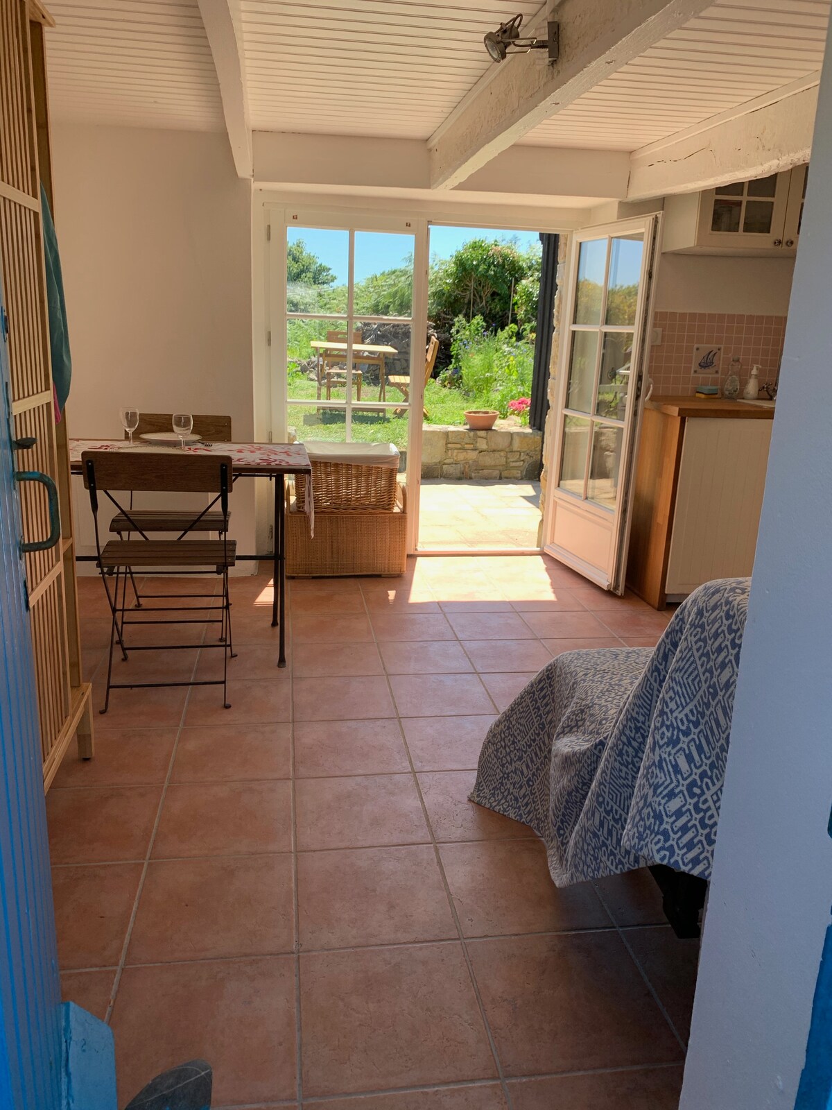 Kleines Penty voller Charme, renoviert, ca. 40 m2, bestehend aus einem Zwischengeschoss mit Doppelbett + 1 zusätzlichem Bett, ausgestattet mit WLAN, einem Wohnzimmer mit Holzofen, einer Einbauküche mit Kaffeemaschine, Wasserkocher, Mikrowelle, Backofen, Induktionskochfeld, einer Waschmaschine und einem Badezimmer (Waschbecken, Dusche), Bettwäsche und Handtücher werden gestellt, mit einem geschlossenen Garten von 35 m2, in dem Sie Gartenmöbel, Liegestühle und Grill finden.
