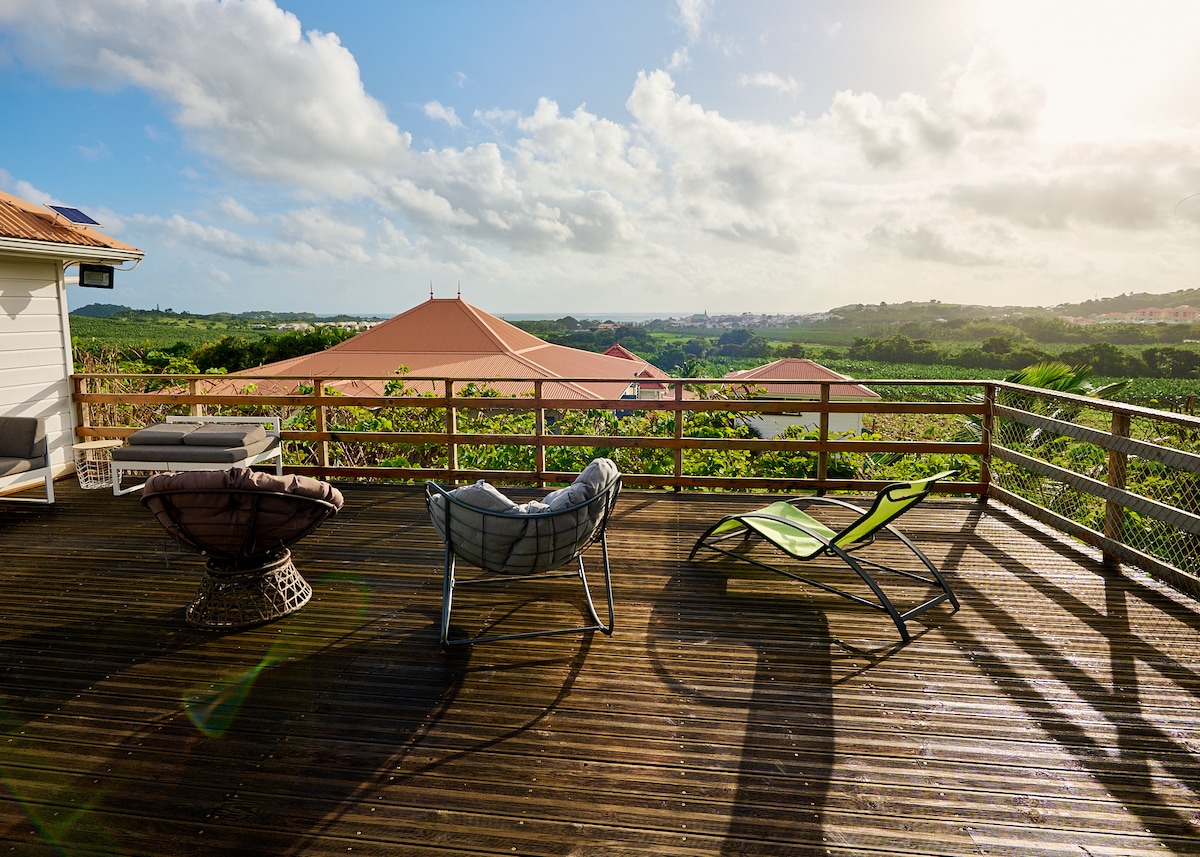 Kay Cumaru: Eine Auszeit zwischen Meer und Natur. Willkommen in Kay Cumaru, einem Holzhaus, das wir 2015 in der Gemeinde Le Marin komplett mit Leidenschaft entworfen und realisiert haben. Eingebettet auf den Höhen der Landschaft von Marin bietet es einen herrlichen Blick zwischen Meer und Grün, alles in einer intimen Umgebung, ohne Gegenüber. Dank seiner privilegierten Lage genießt es eine ausgezeichnete natürliche Belüftung und ist von einem tropischen Garten sowie einem üppigen Wald umgeben.