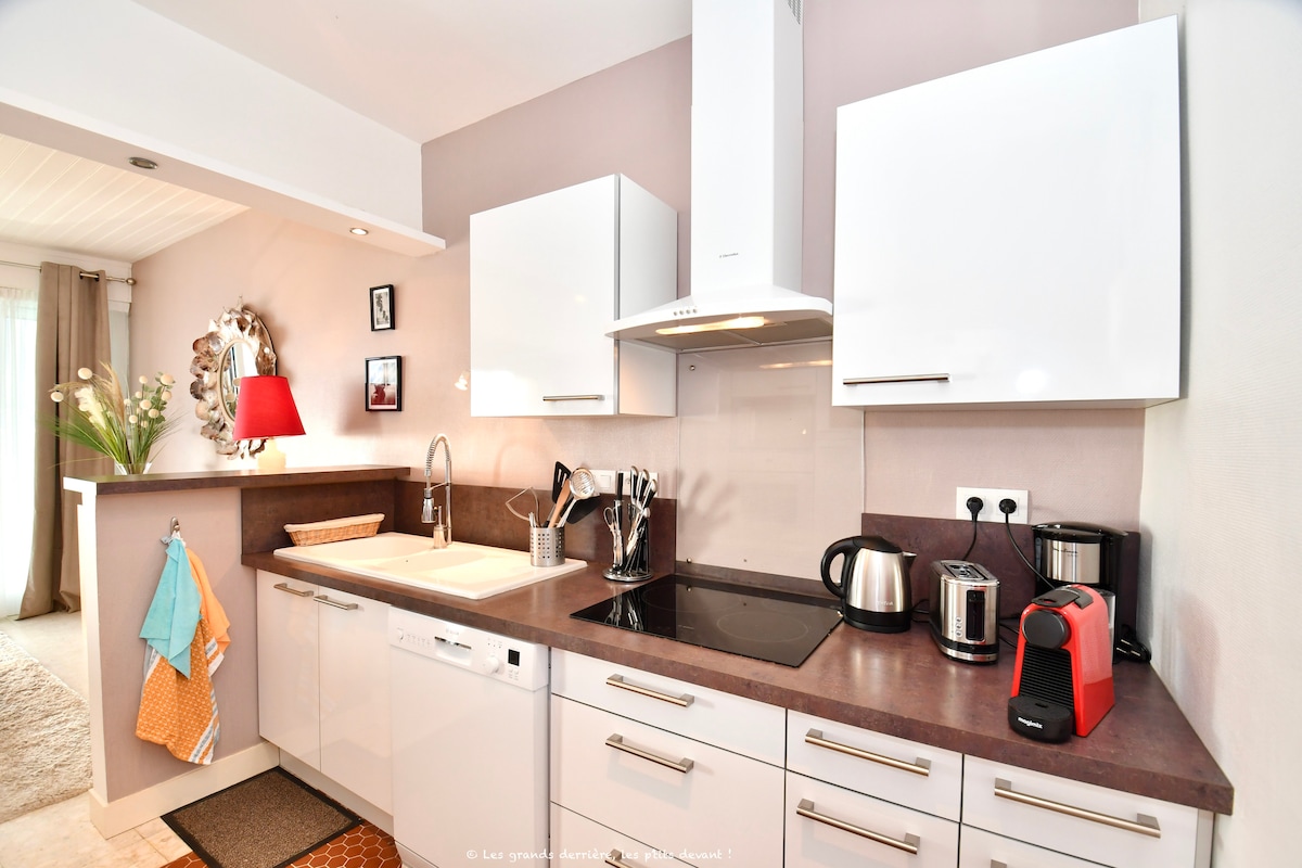 50 m vom Meer entfernt verbindet dieses helle Holzchalet (75 m²) Komfort, Zugänglichkeit und Gelassenheit. Behindertengerecht (ausgestattetes Badezimmer, einfache Fortbewegung), verfügt über 3 Schlafzimmer, eine reversible Klimaanlage, eine hochwertige Küche und ein Wohnzimmer mit Glasfaser + Netflix. Geschlossener Garten, schattige Terrasse, Plancha und Pétanque für gesellige Momente. Reisen Sie mit leichtem Gepäck: Bettwäsche und Handtücher werden bereitgestellt, die Betten sind bei Ankunft gemacht, Reinigung inklusive. Ideal für Familien, Telearbeit und lange Aufenthalte.